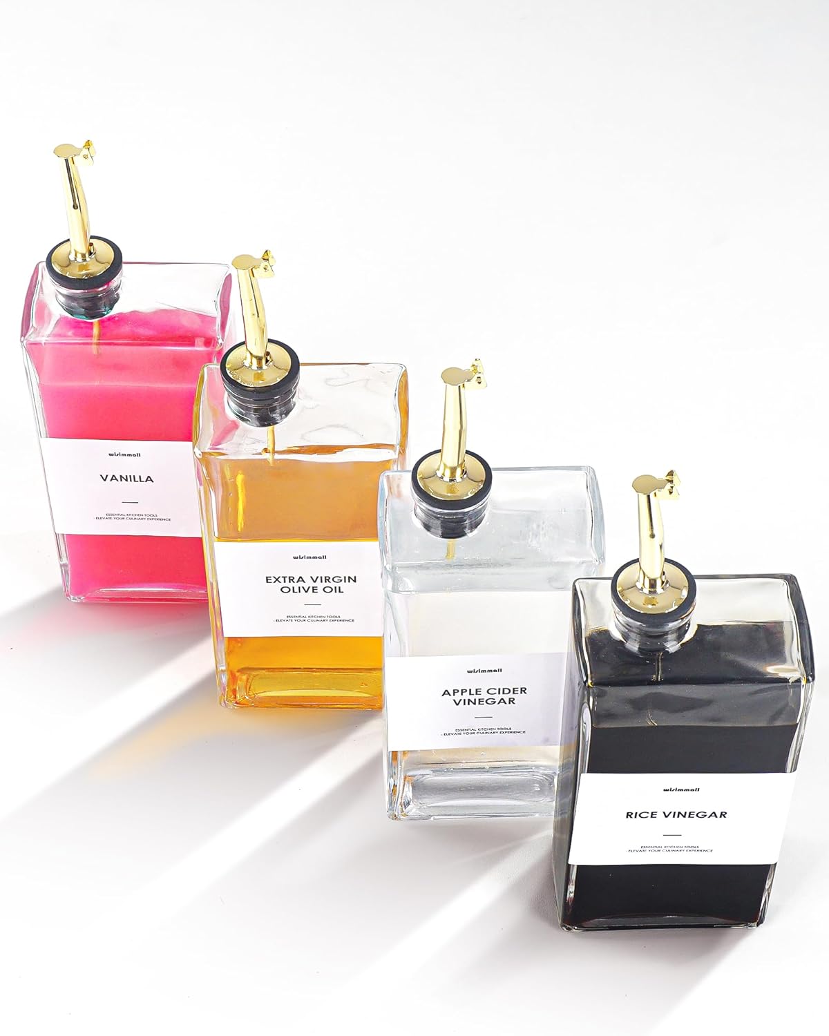 - [17OZ/500ML Large Capacity Olive Oil Dispenser Bottle]: With elegant rectangular cooking oil dispenser enhance your kitchen decor also very pragmatic. This set includes two high-quality 17 oz (500 ml) glass bottles, 2 gold pourers, 1 funnel, and 40 designed labels and 4 blank labels for your custom use.