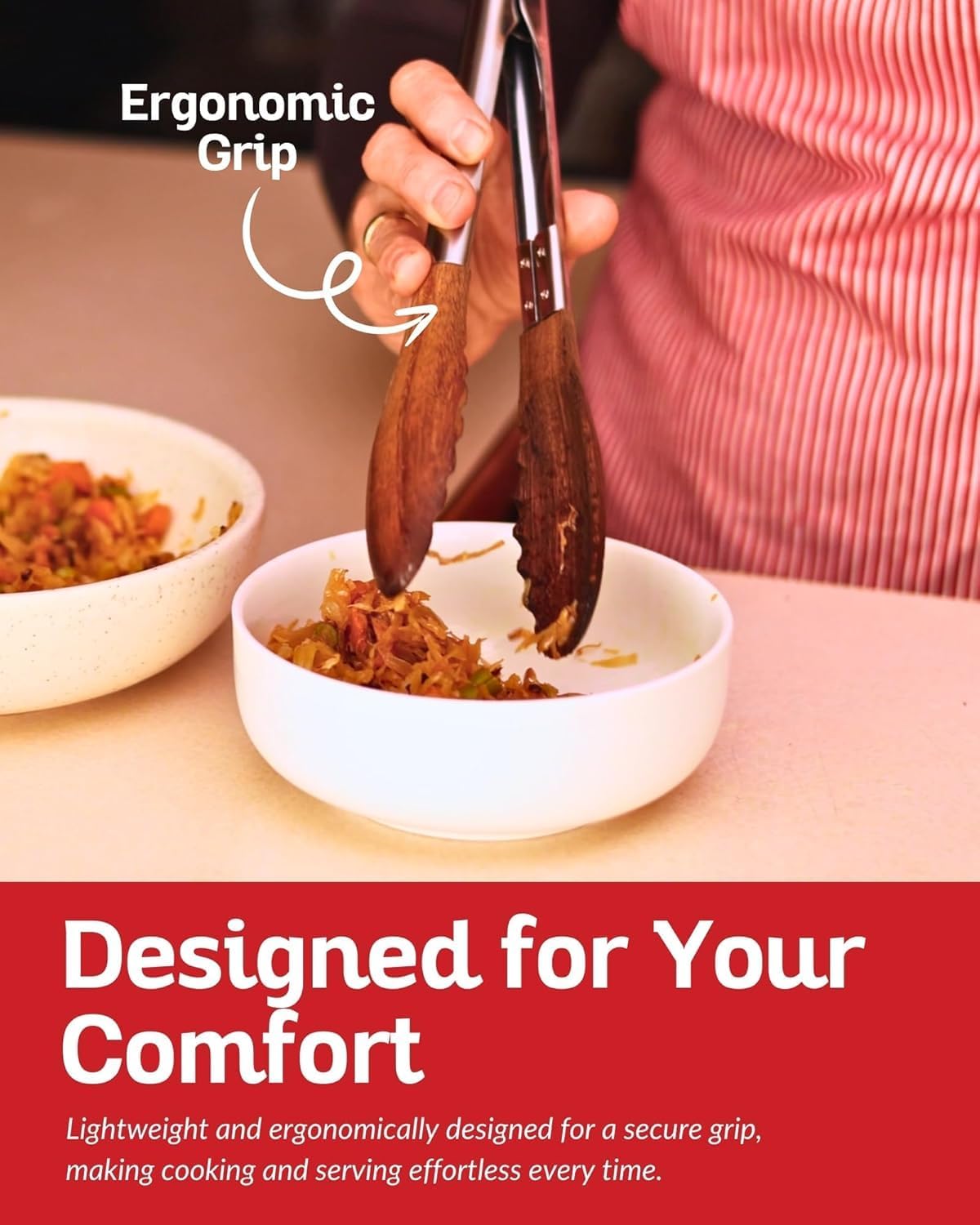 - SCRATCH-RESISTANT: Our tongs for serving food come with wooden tips, ensuring they are gentle on all types of cookware. Wood Tongs, ideal for cooking, grilling, BBQ, and tossing salad, they prevent scratches on non-stick surfaces, making them a safe choice for your favorite pots and pans.