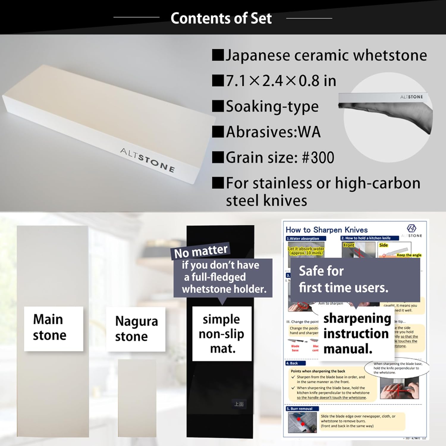- [Weight] Main stone 430g, Nagura 70g. Soaking type. Vitrified firing method (ceramic whetstone)