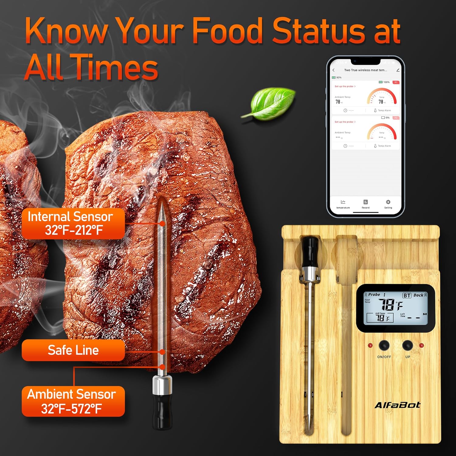 AlfaBot Wireless Meat Thermometer with 2 Meat Probes, 520 FT Bluetooth Meat Thermometer with Digital Food Thermometer for Remote Monitoring of BBQ Grill, Oven