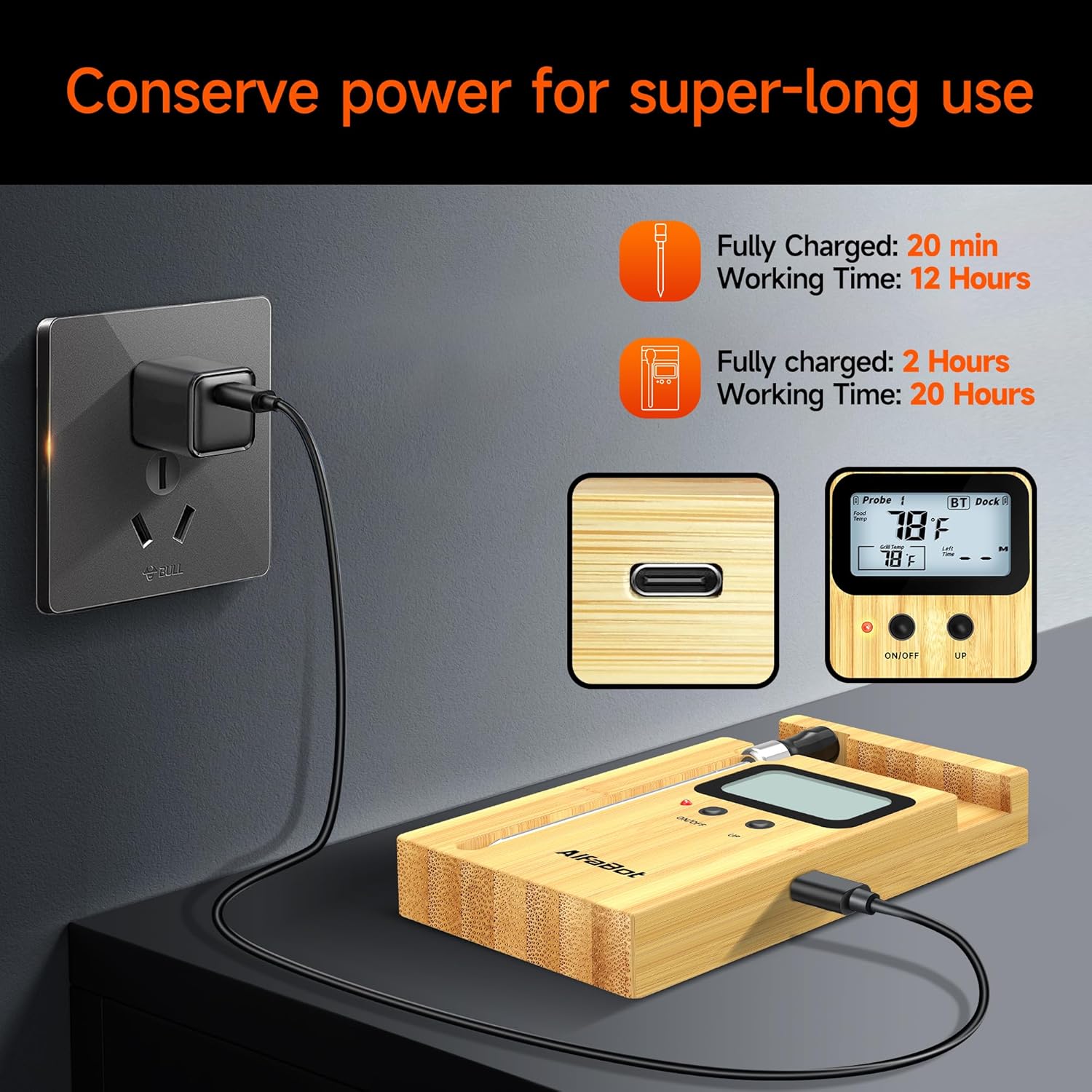 - Bamboo Block Charger: The stylish bamboo block not only holds your AlfaBot probes but also serves as the charger, ensuring your wireless meat thermometer is always ready for use.