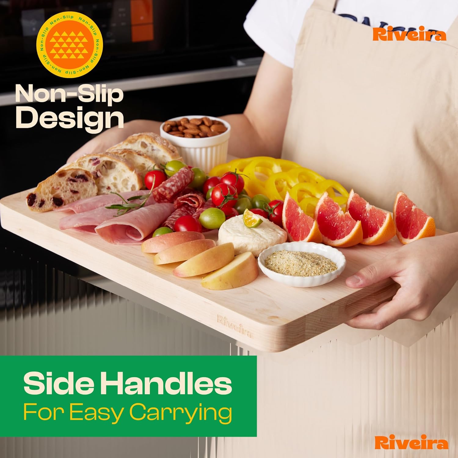 - Premium Crafted Maple — Take a detour from traditional kitchen aesthetics with this maple wood board crafted from 100% natural maple. Beyond being an unconventional and eco-friendly choice, the chopping board wood proudly showcases the environment friendly and organic maple. This wood cutting boards for kitchen counter adds an unexpected touch of confidence and style to your once-orderly culinary space. Riviera's wooden chopping boards for kitchen will be there for you for many years to come.