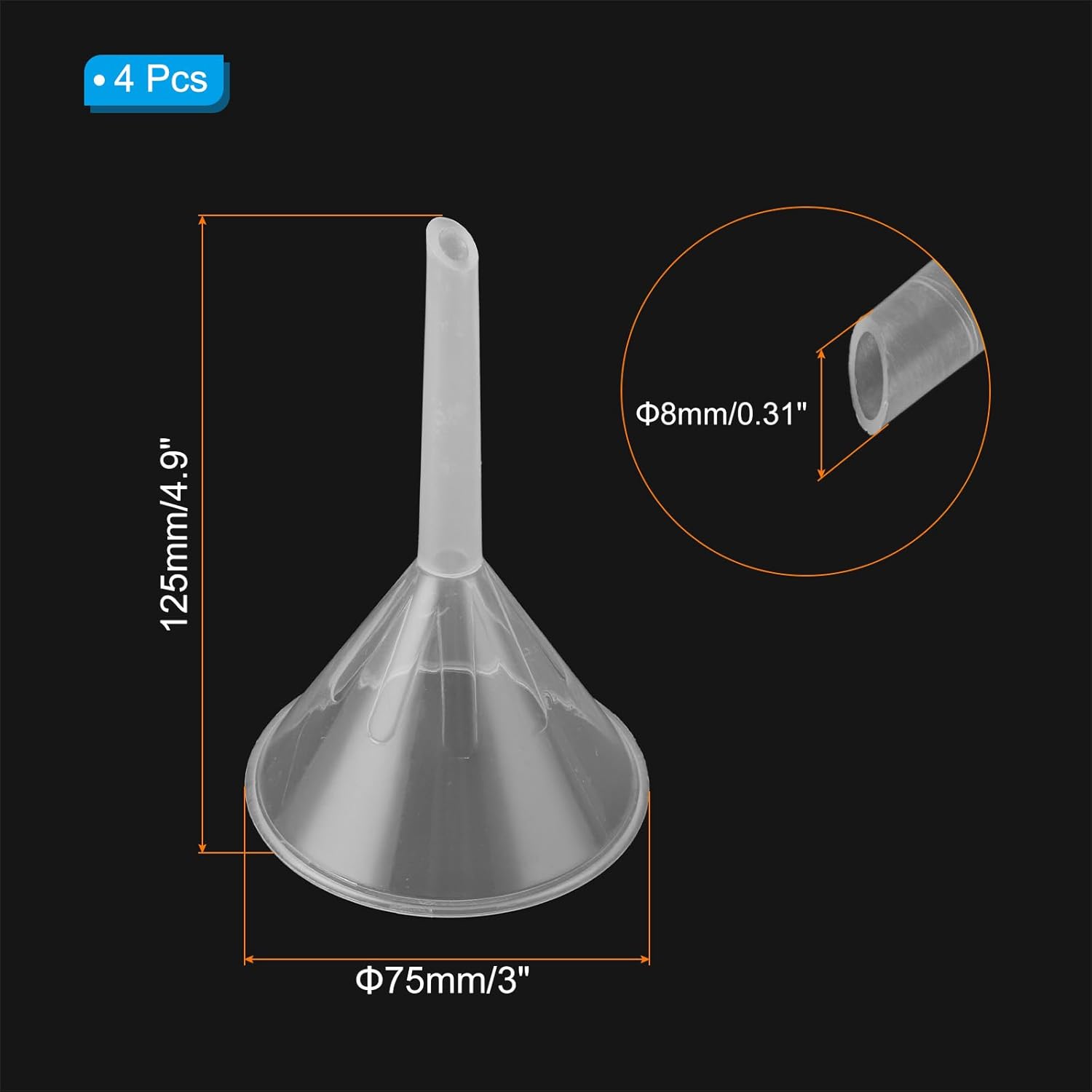 - Color: Clear; Material: PP Plastic; Top Opening Dia: 75mm / 3 inch; Outlet Dia: 8mm / 0.31 inch; Length: 125mm / 4.9 inch; Packing List: 4 x Clear Plastic Funnel