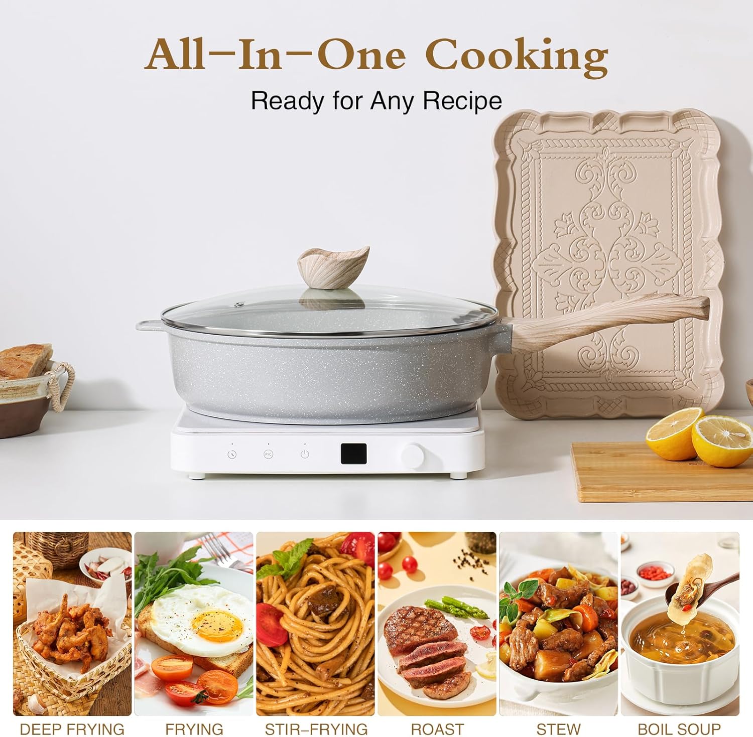- 【Versatile Saute Pan with Lid】: Experience the convenience of our 10" diameter, 2.7" height, and 3.5 quarts capacity ceramic cookware; this large and deep skillet, also functioning as a deep frying pan and induction frying pan, is perfect for stir-frying, frying, boiling and deep-frying a variety of dishes with ease