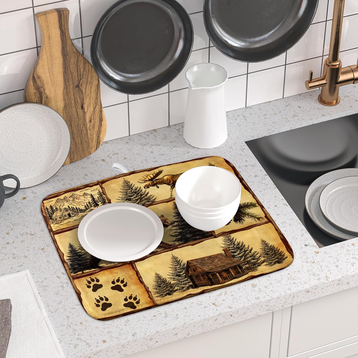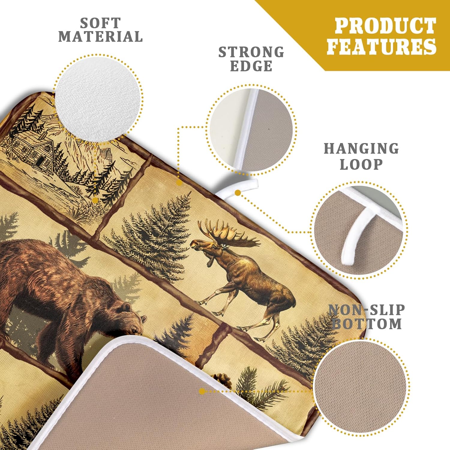 Vintage Bear Moose Dish Drying Mat 16x18 Inch Country Cabin Absorbent Dish Draining Mat Heat Resistant Drying Pad for Counter Sink Home