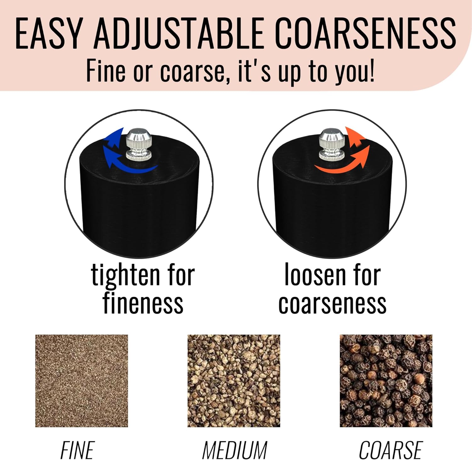 - ADJUSTABLE COARSENESS - Our twist salt pepper grinder set has an adjustable ceramic grinder head. Simply Twist the Top Knob to adjust to your preference. Tighten for Fine Spices and Loosen for Coarse Spices.