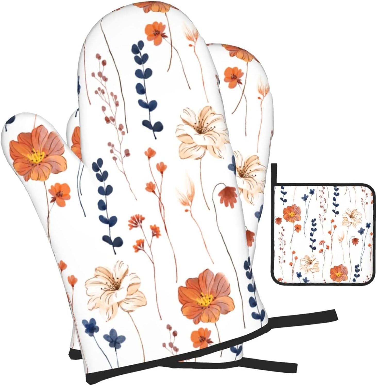 Watercolor Orange Floral Oven Mitts and Pot Holders Set Heat Resistant Non Slip Set of 3 Navy Blue and Orange Flower Decorative Kitchen Gloves Hot Pads for Cooking BBQ Baking Grilling