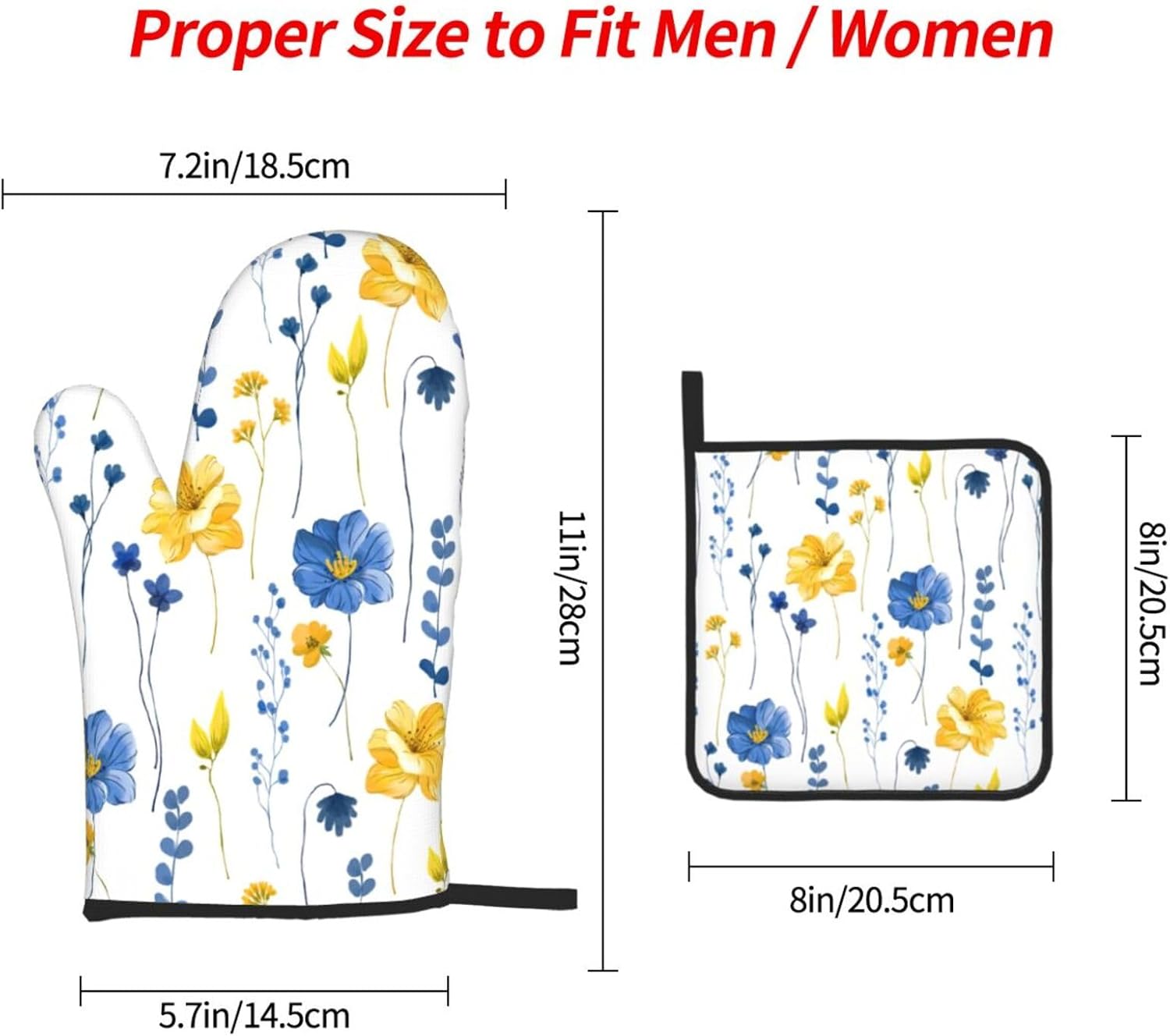 - Size: Oven mitts and pot holders sets kitchen accessories include 2 kitchen heat insulation gloves 7.2 x 5.7 x 11 inches and 1 pot pads 8 x 8 inches