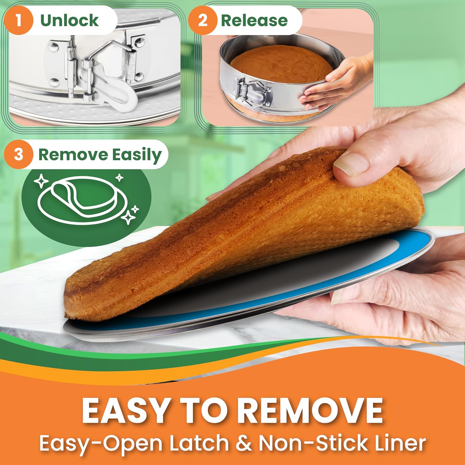 - 100% NON_TOXIC, NON-REACTIVE MATERIALS FOR SAFE, HEALTHY BAKING – Bake with confidence using our 304 stainless steel spring form pans 9 inch and food-grade silicone liner. Free from PFOA, PFOS, B.P.A., and lead, with our set, you can forget about the release of harmful chemicals into your food, ensuring a safe and healthy baking experience for you and your family.