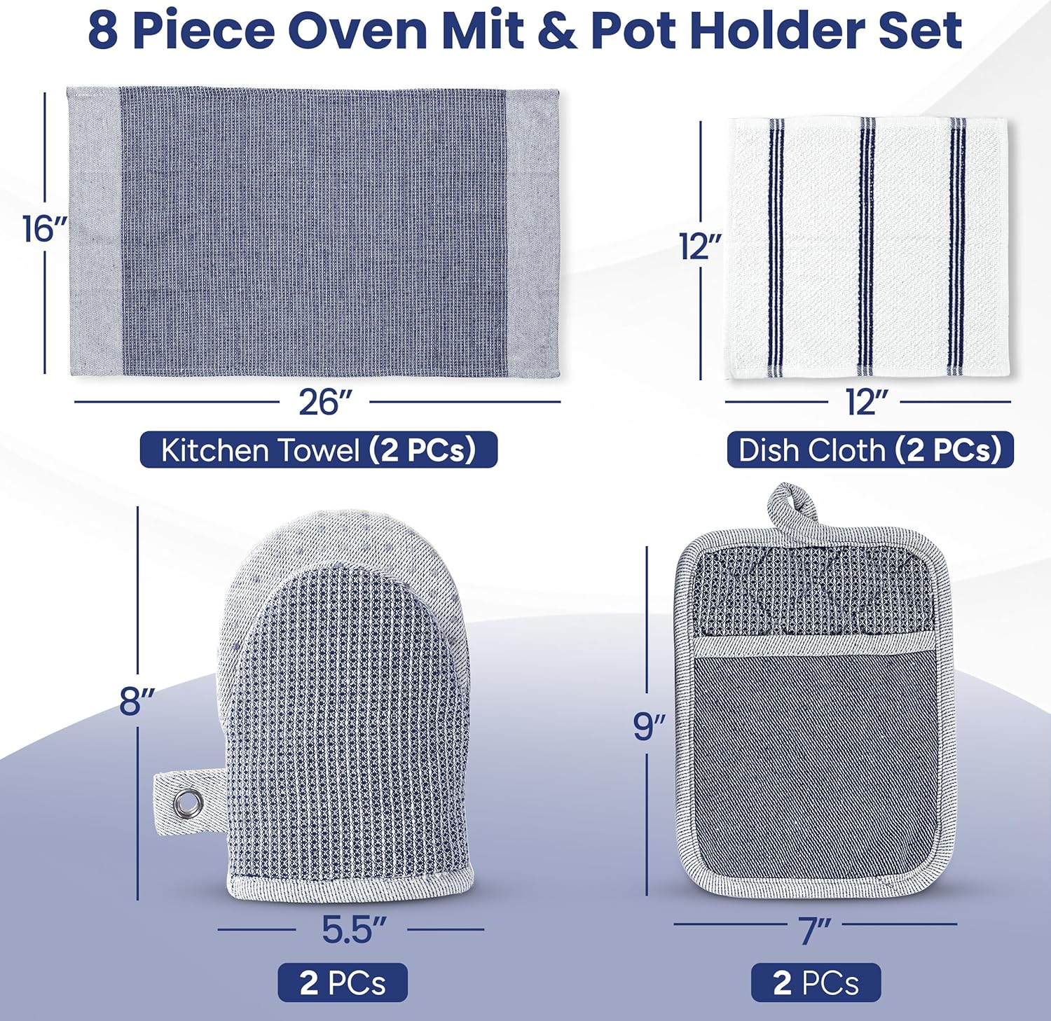- 8-PIECE KITCHEN ESSENTIALS – ALL-IN-ONE SET – This set includes 2 kitchen towels (16"x26"), 2 terry cloth dish towels (13"x13"), 2 heat-resistant gloves for cooking (5.5"x8"), and 2 silicone pot holders (7"x8"). Designed for daily use, these potholders for kitchens are durable, stylish, and perfect for any home or RV.