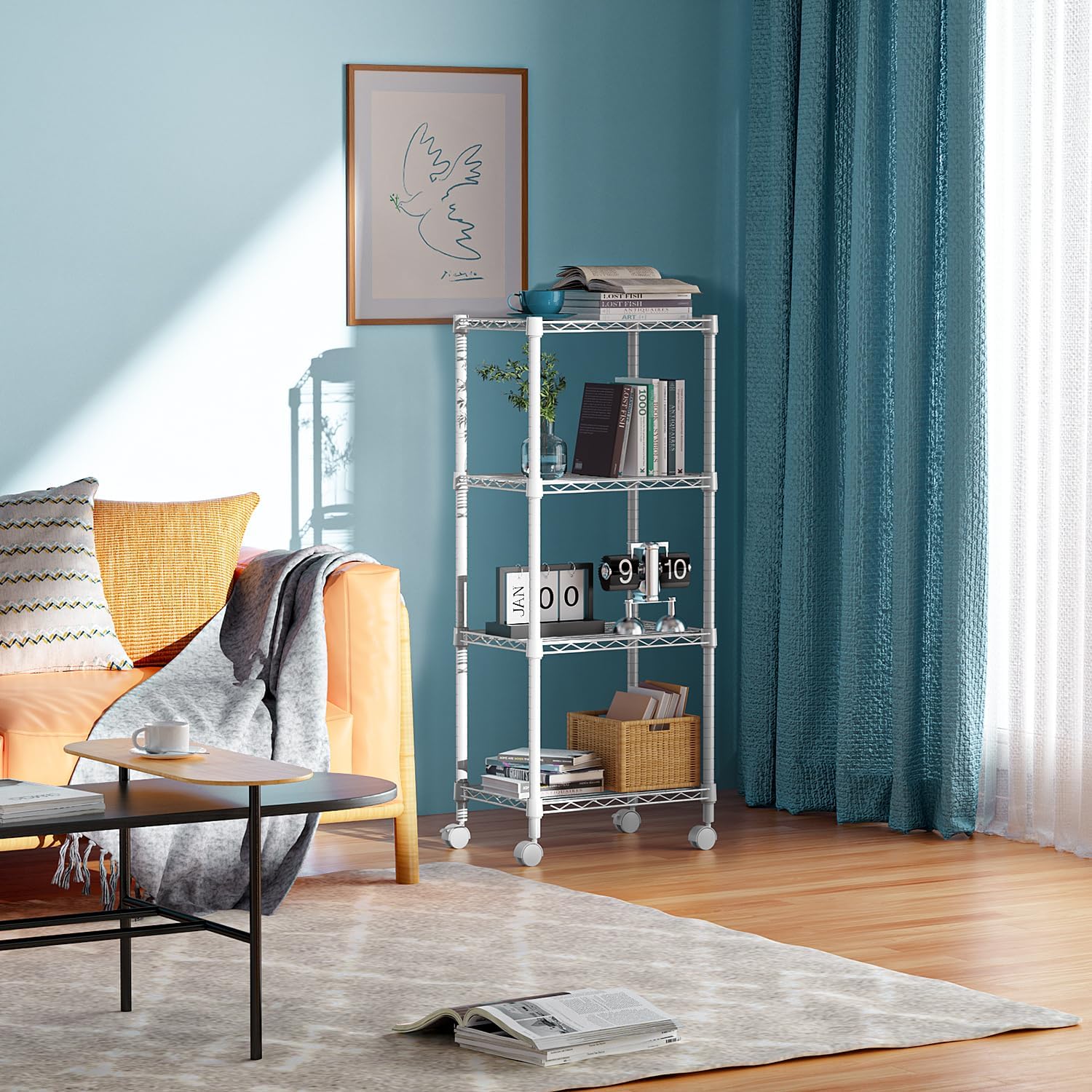 1000 lbs 4-Shelf Adjustable Heavy Duty Steel Wire Rack, Adjustable Storage Shelving Unit with Wheel for Kitchen, Garage, Laundry White 11.8" D x 17.7" W x 40.8" H
