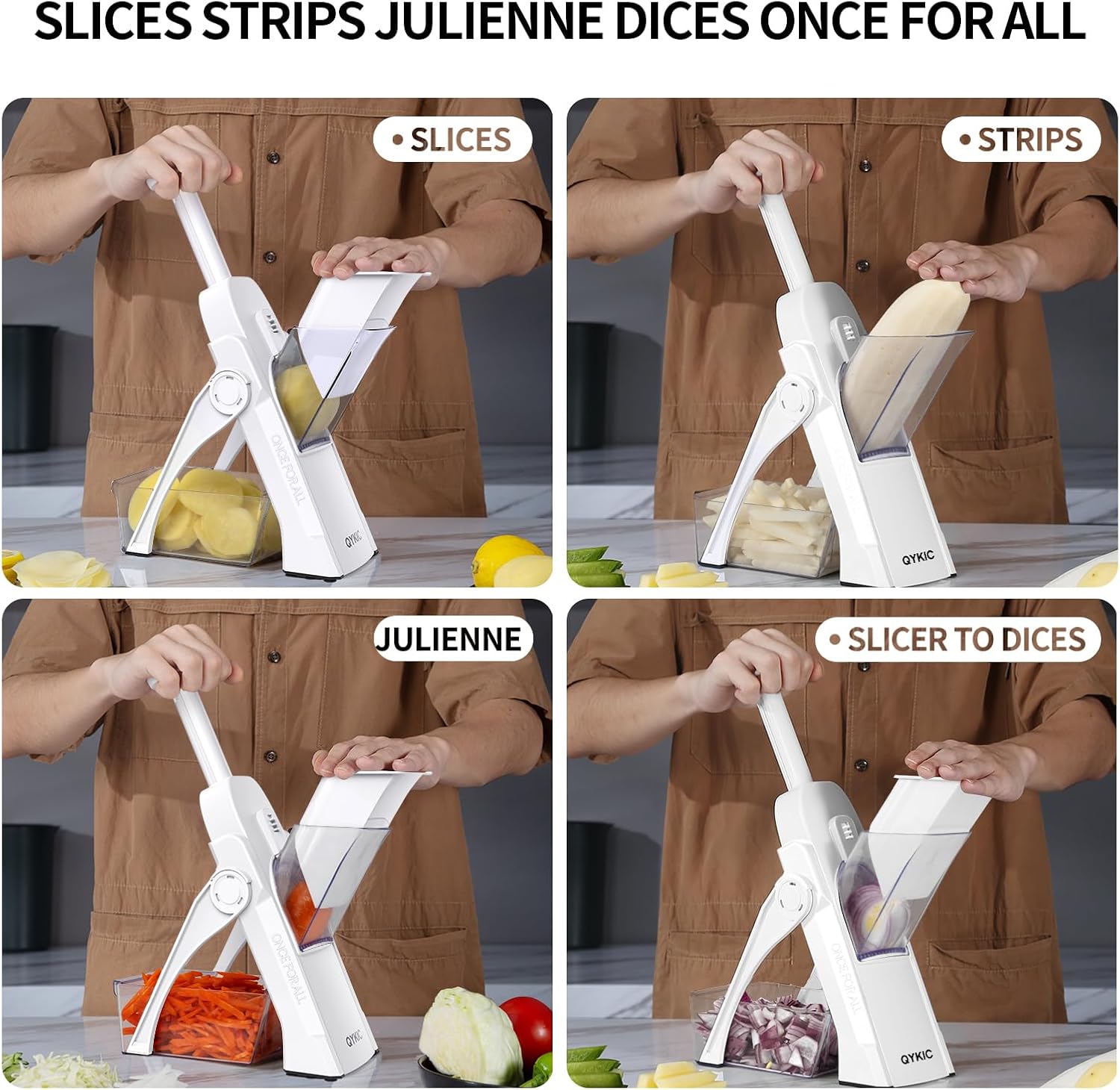 - SAFER MANDOLINE SLICER: This mandoline slicer built-in blades design prevents your hands cut to. This vegetable food slicer saves the trouble and safety hazards of replacing the blades, you can easily and safely cut vegetables and fruits, It's a good helper for making potato chips, french fries, and salads.