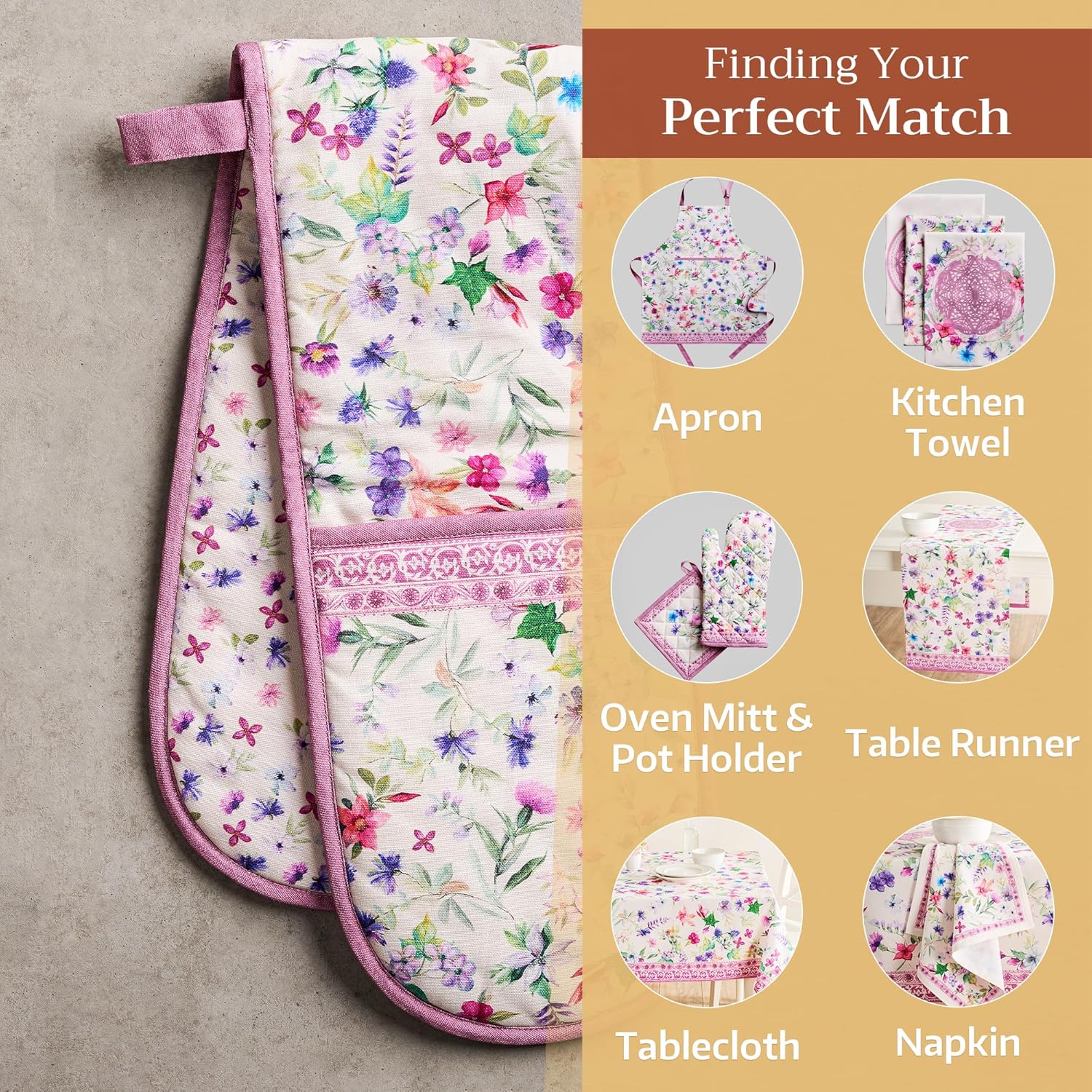 Maison d' Hermine Double Oven Mitts 100% Cotton 7"x35" Double Oven Mitt Heat Resistant BBQ Cooking Gloves with Loop, Baking, Grilling, Home, Kitchen, Handling Hot Pans Spring Summer (Chardon)