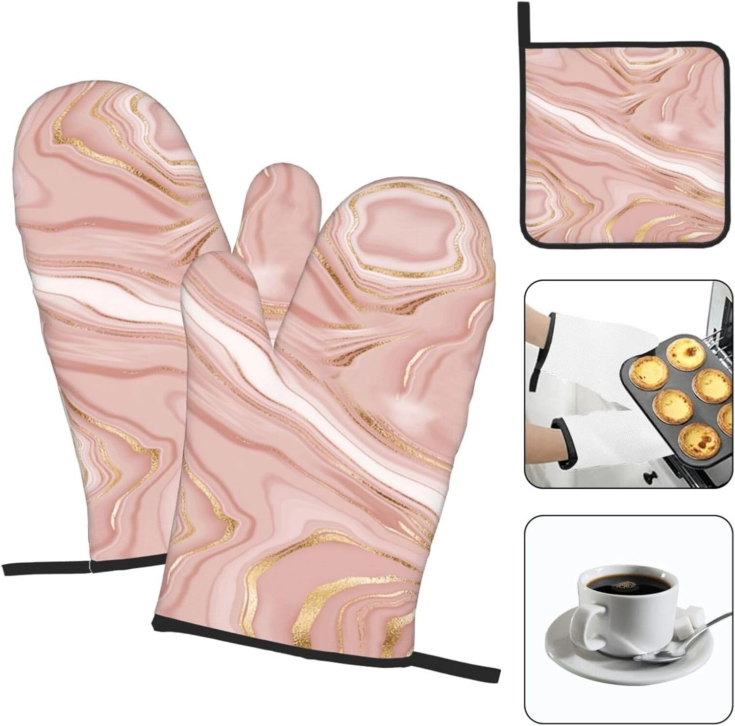 Pink Golden Marble Oven Mitts and Pot Holders Sets of 3 Heat Resistant Hot Pads Rose Pink Modern Oven Gloves for Kitchen Cooking BBQ Baking