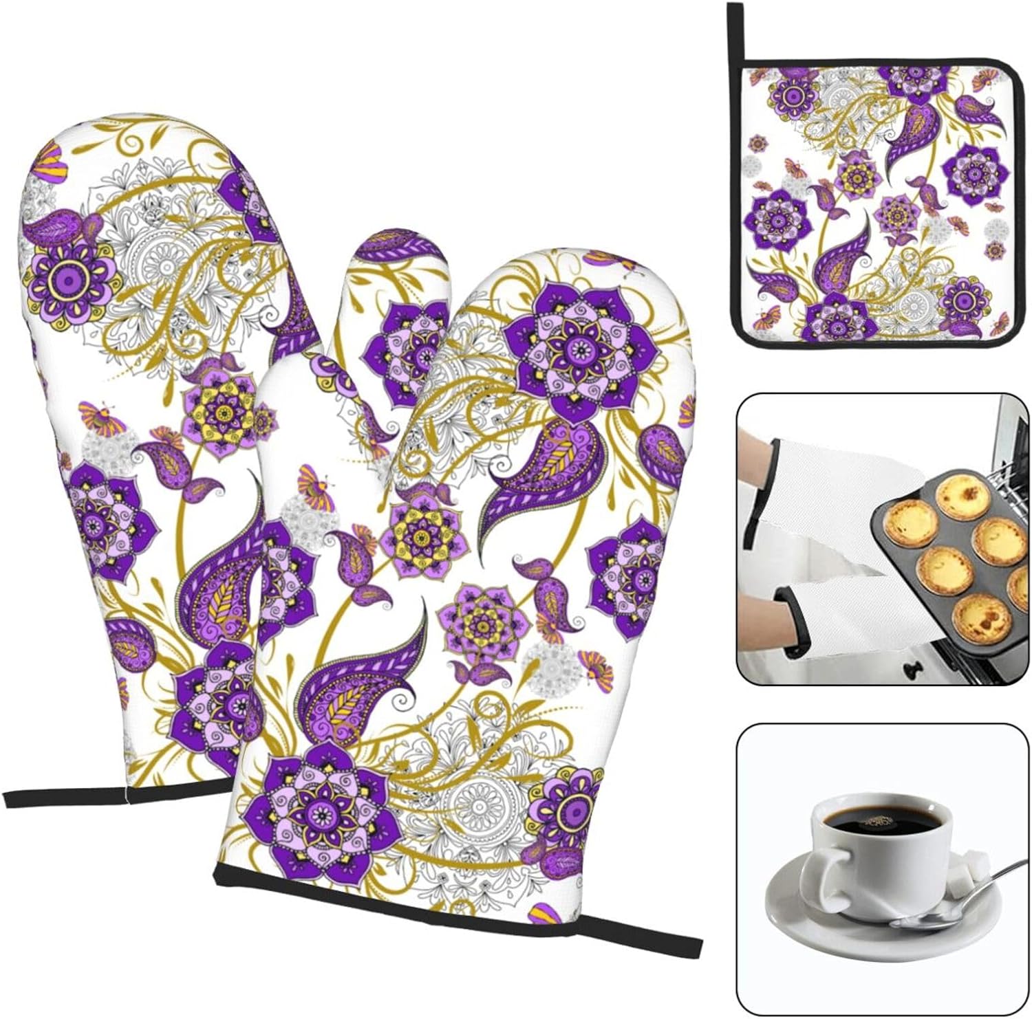 - Material: Oven mitts and pot holders sets include 2 baking gloves and 1 pot pads. Kitchen decor oven mitts are made of heat resistant polyester fabric, soft quilted cotton lining making, non-slip, heat resistant