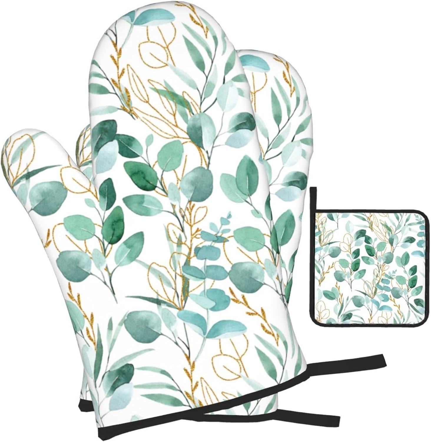 Sage Green Leaves Oven Mitts and Pot Holders Sets Heat Resistant for Kitchen BBQ Microwave Baking Grilling Cooking Set of 3 Cute Botanical Kitchen Oven Glove