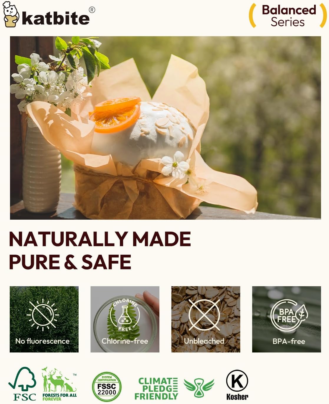 - Healthy & Natural: Certified by KOSHER and FSC, katbite parchment paper, part of the product, packaging and wrappings of paper are made from fsc-certified wood. Made from 100% natural wood pulp, our unbleached and fluorescent-free parchment paper ensures reliability without any safety concerns. Featuring food-grade silicone coating on both sides, these sheets provide a safe, non-toxic baking surface.Trust Katbite Balanced Series for a healthy, natural, and sustainable baking experience.