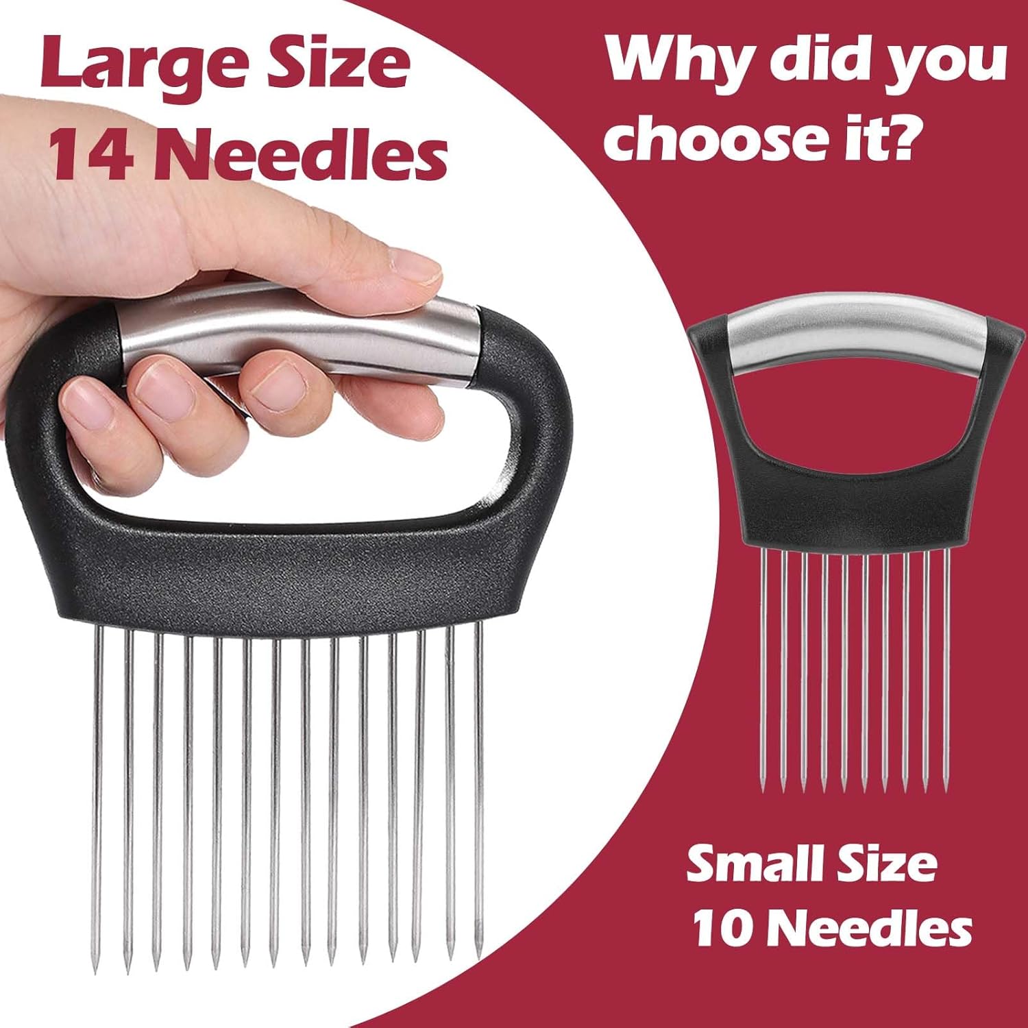 - Large Onion Slicer with 14 Long Needle: This versatile kitchen tool is a game-changer in the cooking. Its unique 14 stainless steel forks under the handle provide a comfortable grip, ensuring neat slicing of onions, tomatoes, and lemons without slippage, prevent slippage while cutting with the comfortable handle of the Onion Holder Slicer