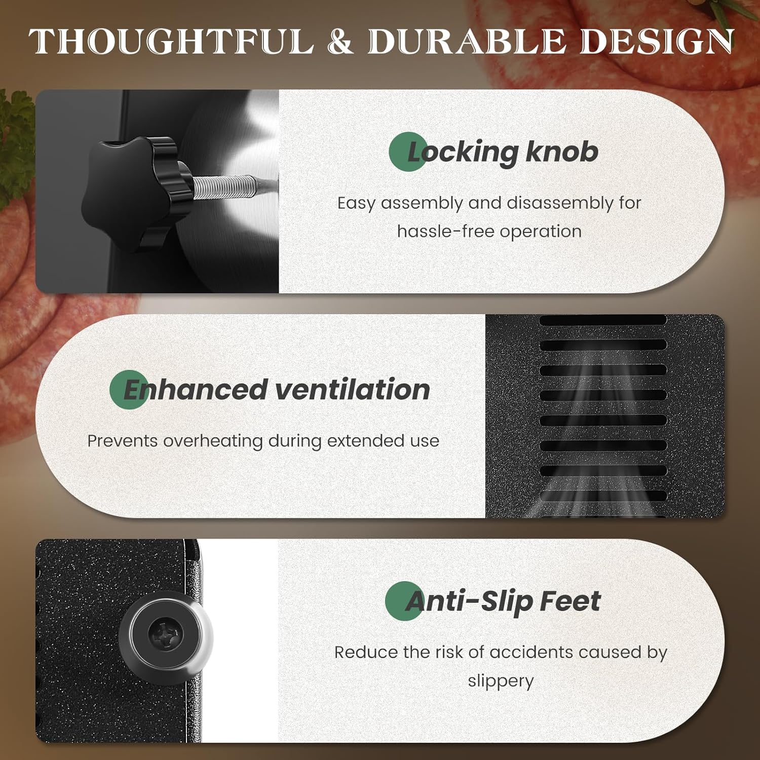 - [Thoughtful design] No more wobbly disasters! The locking knob of Huanyu meat grinder secures the grinding head in 2 seconds. Ventilation ports act like a cooling system. Bonus: Non-slip feet grip countertops like a wrestling mat, even at max speed