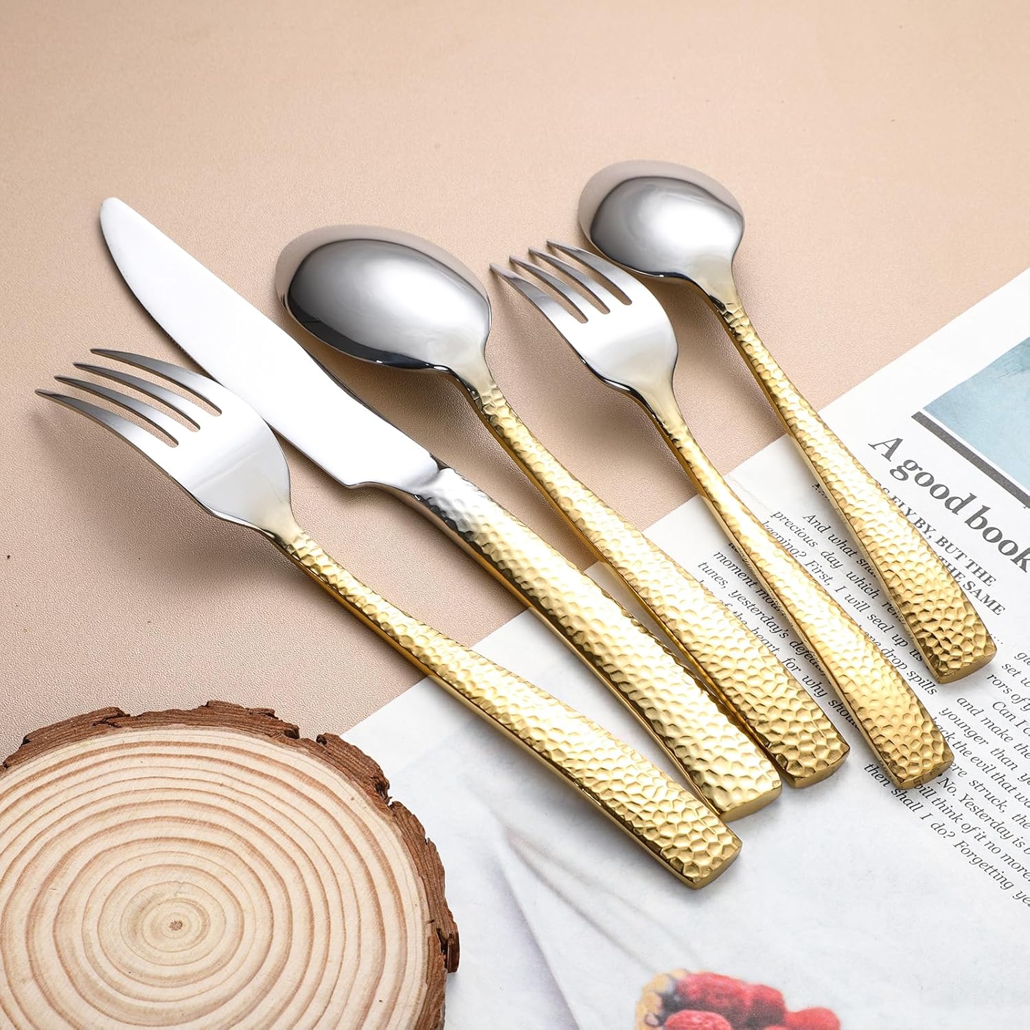 Hammered Silverware Set For 4,Forks and Spoons 18/10 Stainless Steel Heavy Duty Silverware Gold Cutlery Set 20 Piece Flatware Set,Mirror Polished,Dishwasher Safe (20 pcs gold)