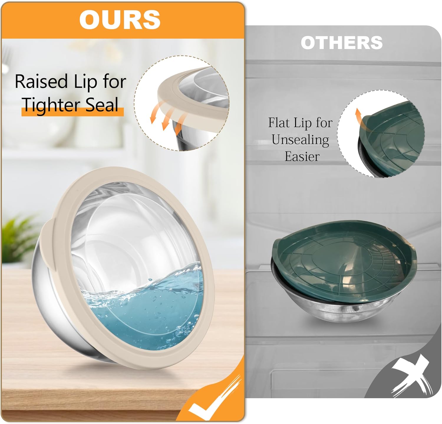 - USEFUL LIDS: These airtight lids with raised lip for sealing tightly, Helping keep the food fresh in the refrigerator for longer time and leak-proof, The lids with transparent design allow you to see the food inside the bowls and no need to open, Convenient for checking what’s stored, Arched design on one sides of the lid for easy opening and closing