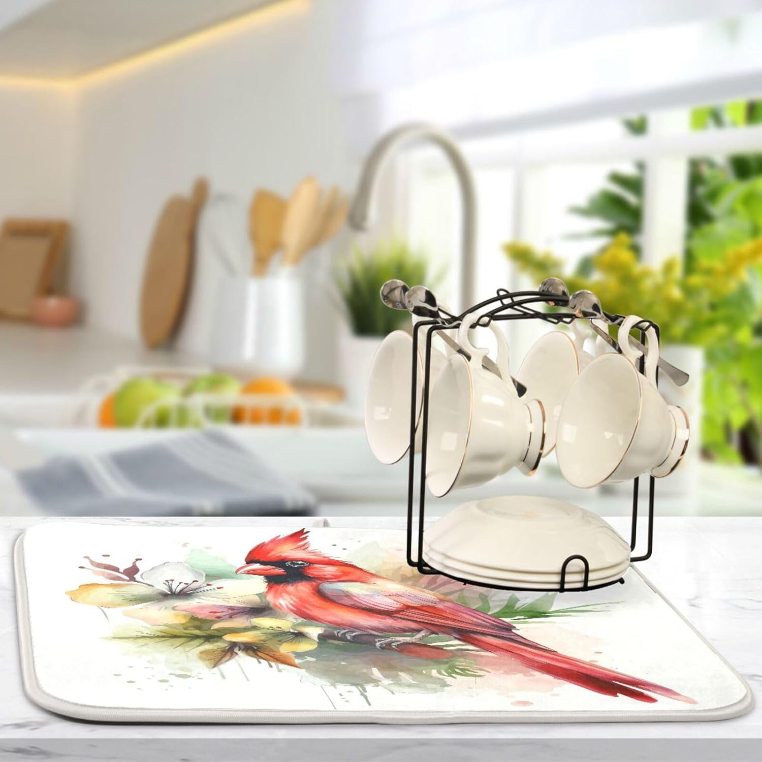 Cute Cardinal Christmas Dish Drying Mat for Kitchen Counter Absorbent Microfiber Drying Pad, Large 18x24 in, Reversible Drainer Mats