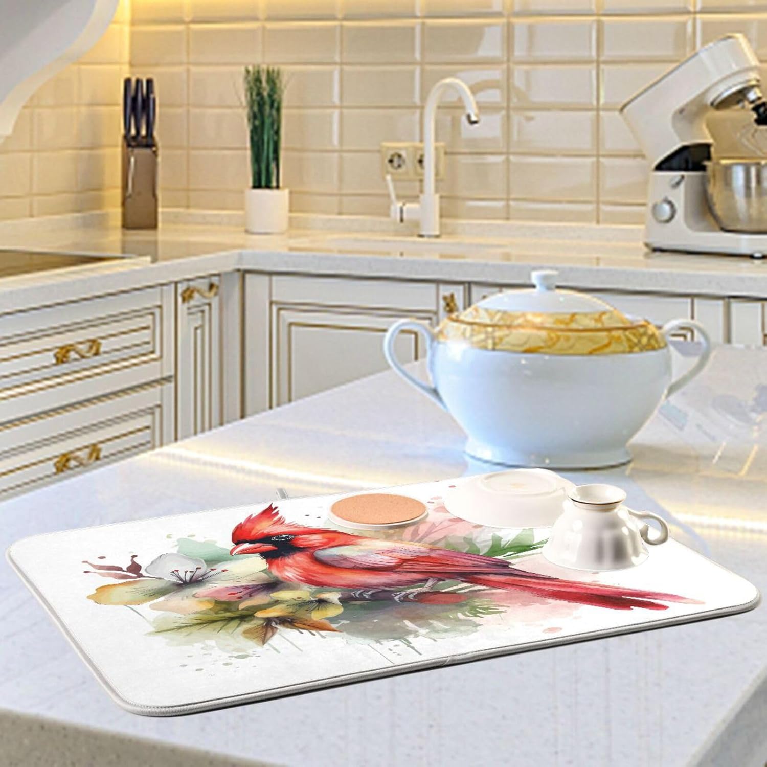 Cute Cardinal Christmas Dish Drying Mat for Kitchen Counter Absorbent Microfiber Drying Pad, Medium 16x18 in, Reversible Drainer Mats