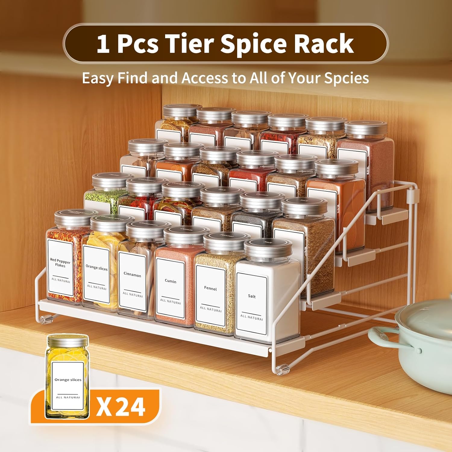 - Metal Material Strong & Sturdy: Spice shelf is made of high-quality metal, the each tier has a sheet metal base design. making the spice bottles more stable to place and less likely to tip over. With cabinet spice rack, you can nicely organized your spice bottles in your cabinet in leveled tiers.