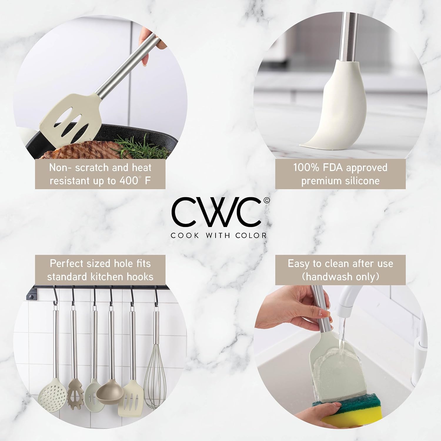 - Make the smart choice with a long lasting set that is constructed from premium food grade silicone to protect your nonstick cookware from scratches and scrapes. Silicone allows for less buildup and mess so these tools will be super easy to clean. Top rack dishwasher safe. Resistant to odors and stains.