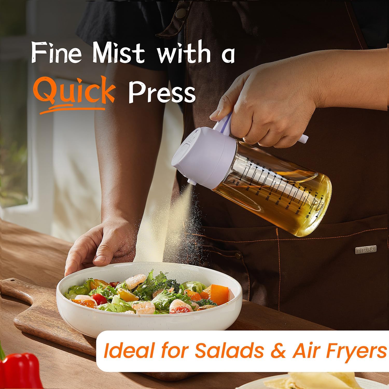 - Precision Spray Nozzle: The olive oil spray bottle features a nozzle that delivers a fine mist or steady stream, offering precise control. It’s perfect for drizzling or spraying, making it an essential oil bottles for kitchen
