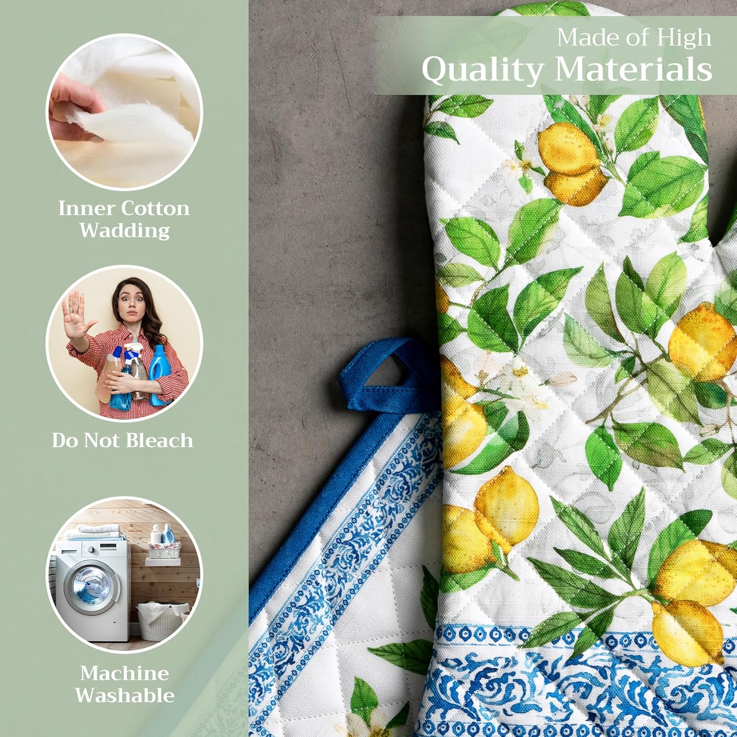 Maison d' Hermine 100% Cotton Oven Mitt & Pot Holder Set (7.5"x13" & 8"x8") Heat Resistant BBQ Cooking Gloves with Loop, Baking, Grilling, Kitchen, Handling Hot Pans Spring/Summer (Cedrat)