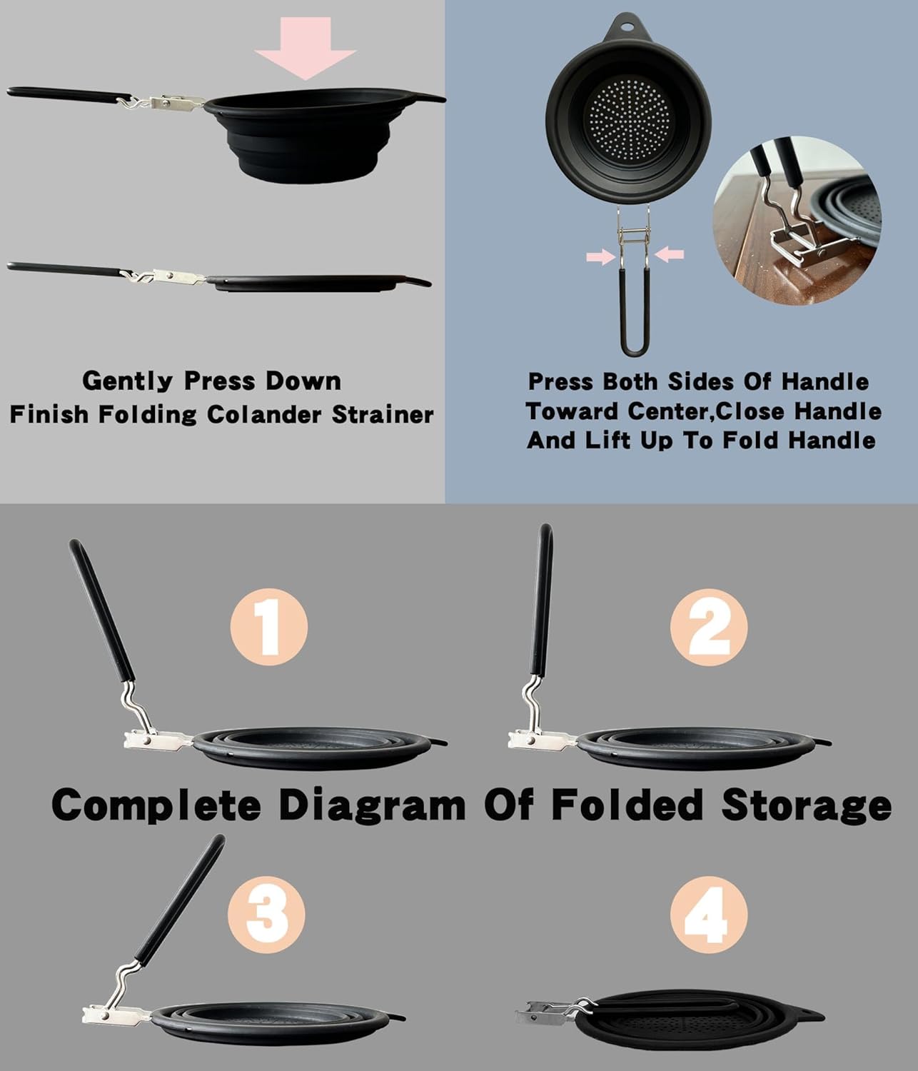 - COLLAPSIBLE COLANDER:Colander strainer and handle is collapsible,it can be placed in drawers,cabinets or hung up to save more space in the kitchen
