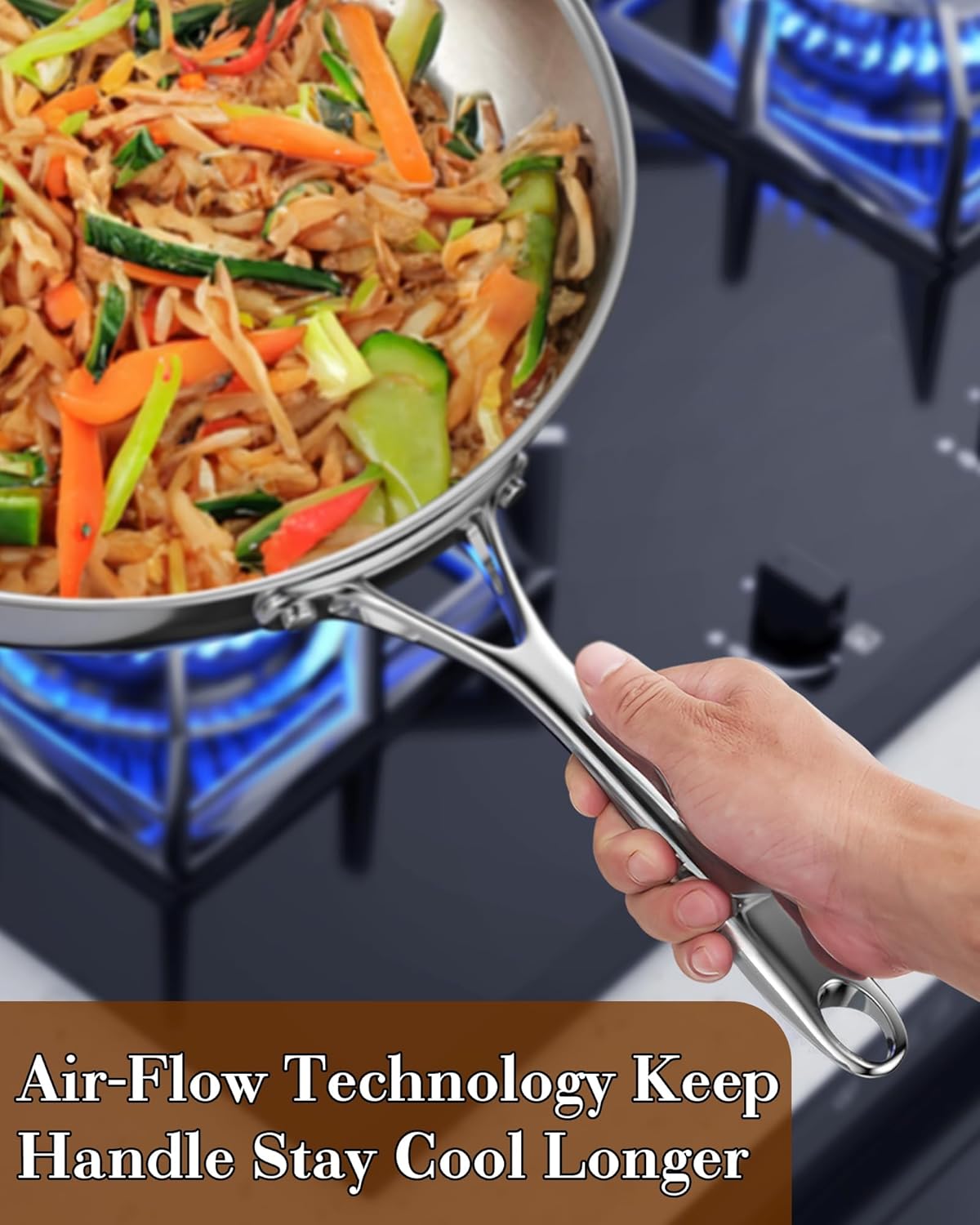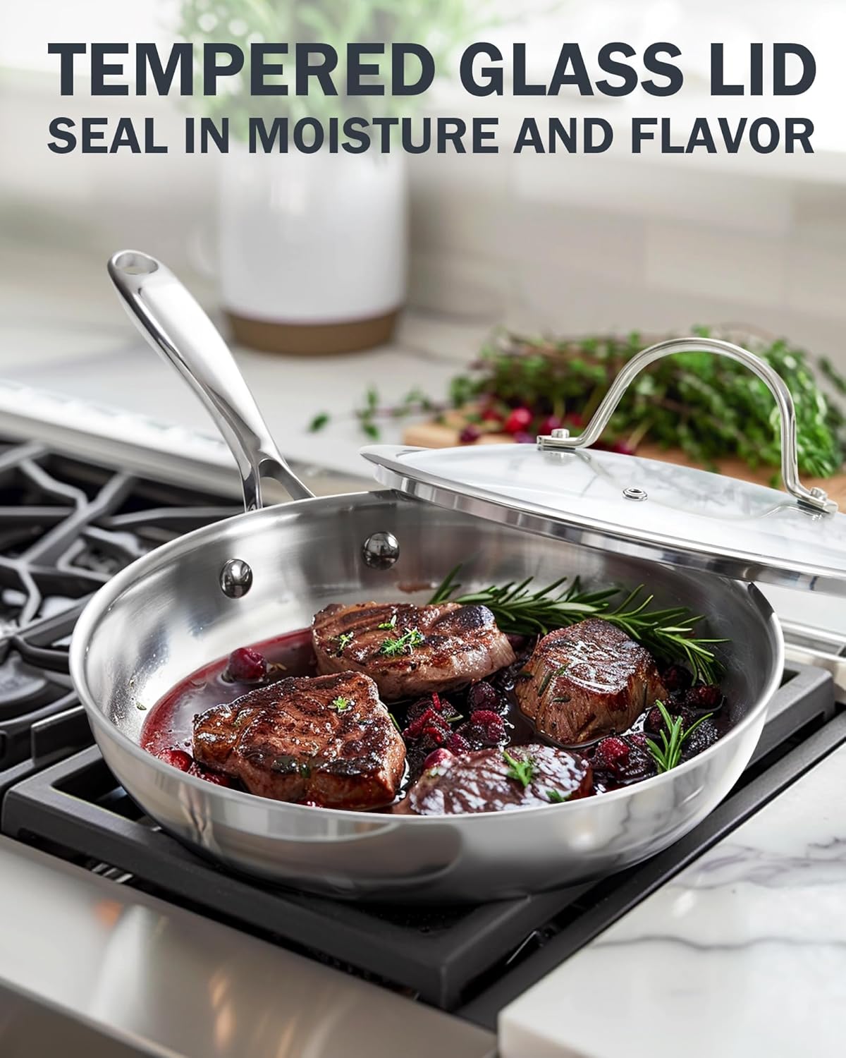 - Ergonomic handle: Stainless steel frying pan equipped with tempered glass lids and steam vent that allow steam to escape for viewing food while cooking; Riveted stainless steel handle with air flow technology is durable, comfortable to hold and stays cool