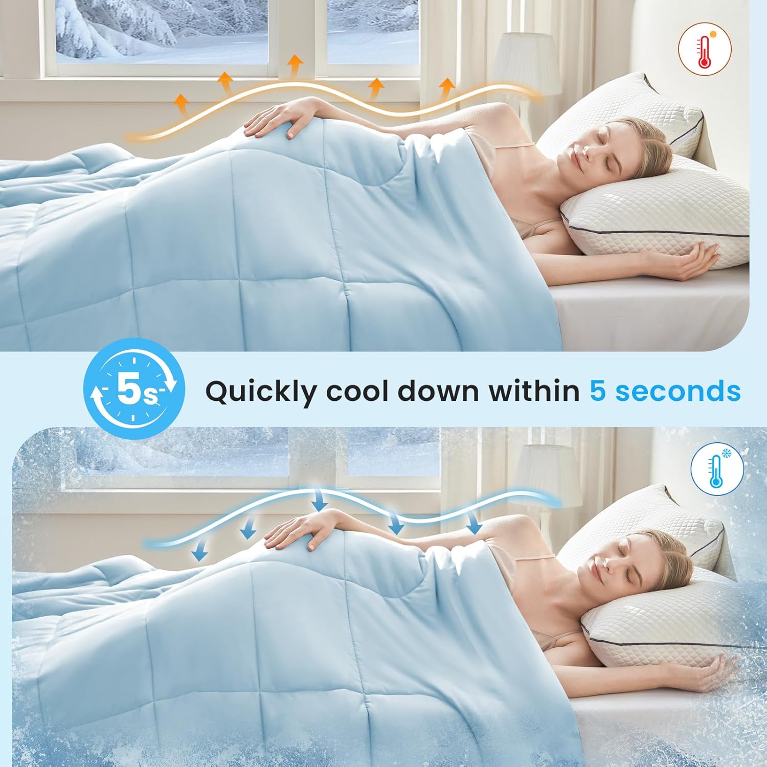 - Cooling blanket for hot sleepers - Designed with latest thermal regulation technology, this cooling blanket can quickly absorb body heat and immediately reduce the skin temperature by 2~5 degrees, ensures a consistently cool sleep environment, makeing you wake up refreshed, comfortable and dry — no sticky feeling. A real summer comforter for hot sleepers