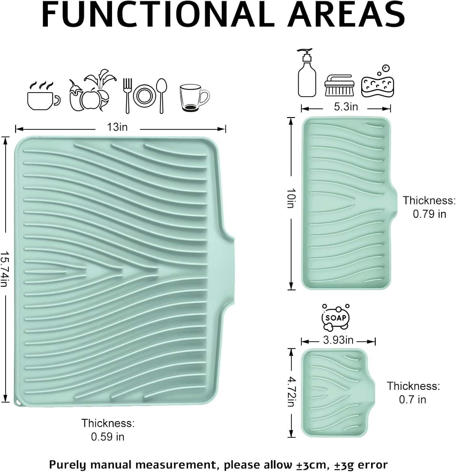- Quick Drying Mat: TIKNIK dish drying mat measures 3 size, where washed dishes can be placed for air drying. The folding, raised and innovative design of the quick dry dish mat allows air to circulate under the dishes,and features unique diagonal ridges to easily remove moisture, and a specially designed rim that lets water drain directly into the sink. This keeps your countertops dry and clean, and says goodbye to wet countertops.