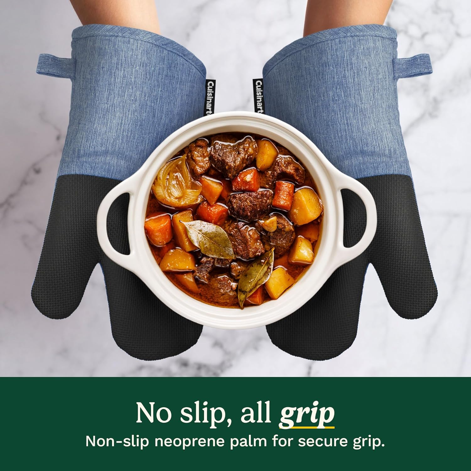 - COOK WITH CONFIDENCE: The Cuisinart Chambray Oven Mitt Set, measuring 7 x 13 inches, features a heat-resistant neoprene palm for superior protection (up to 350 degrees); handle hot cookware with ease and enjoy a secure grip with these oven mits, making cooking, baking, and grilling safer.