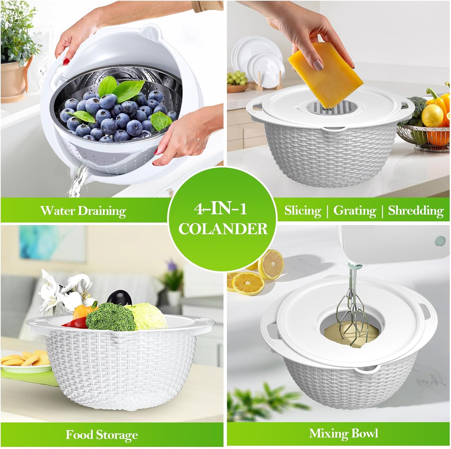 4-1 Colander with Bowl Set - Colander for Kitchen - Strainers and Colanders - Pasta Strainer - Fun Kitchen Presents - Rice Strainer Fruit Cleaner Veggie Wash Cooking Presents, White