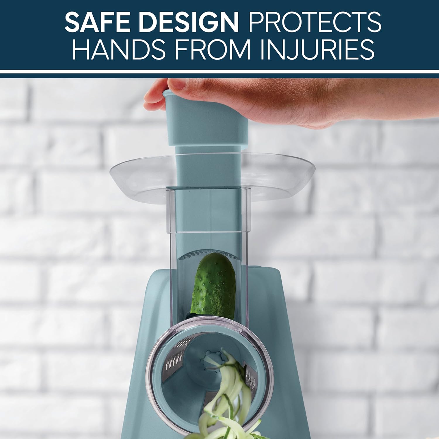 COOK WITH COLOR 5-in-1 Electric Slicer, 150W Food Prep Machine – Parmesan Shredder, Fine & Coarse Graters, Potato Grater, Vegetable Slicer, Compact Design for Bowl Prep, Blue/Grey