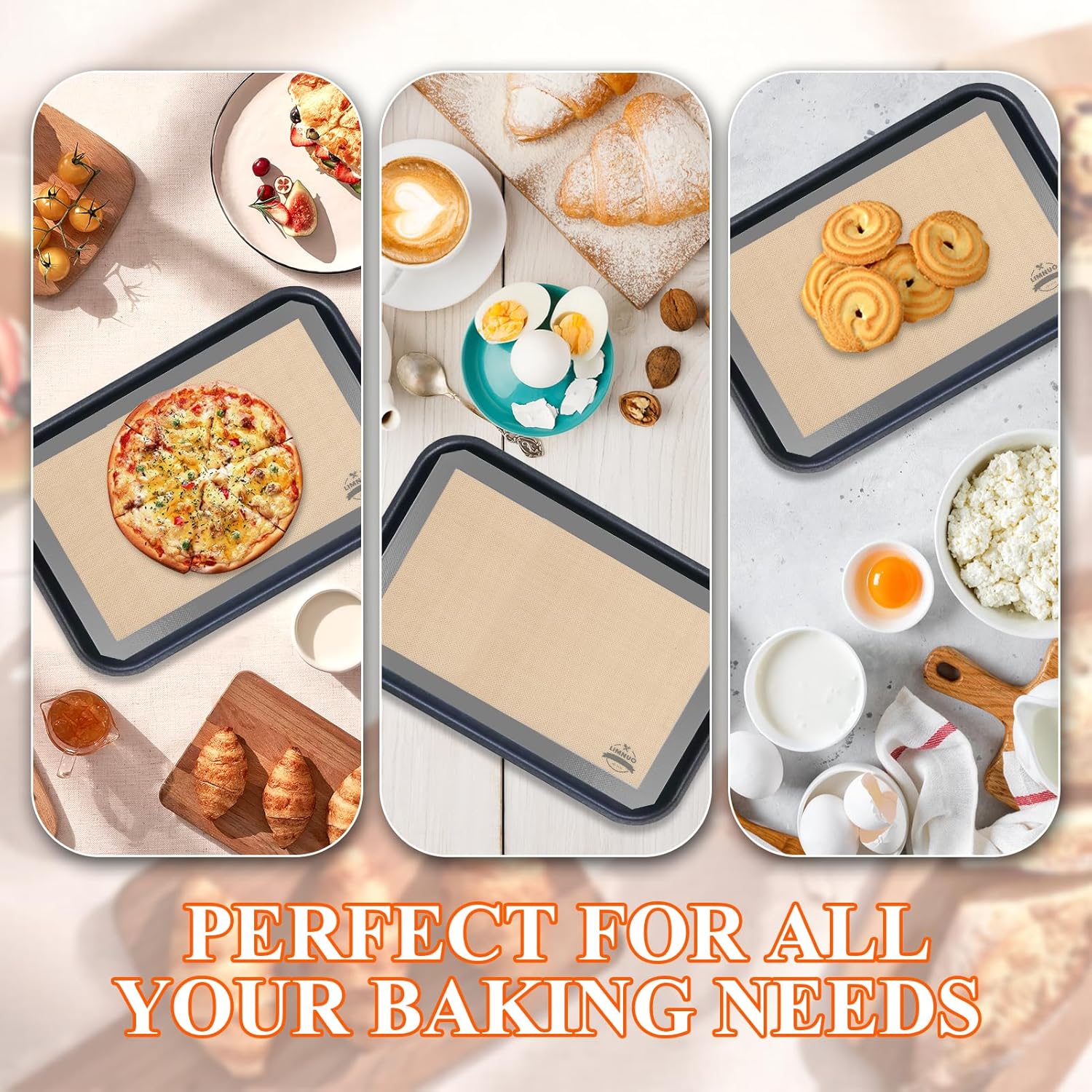 - High quality. Our baking mats are made from food-grade silicone, capable of withstanding repeated use without wear. They can be used in a temperature range from -40°F to 446°F, suitable for various baking and roasting needs.