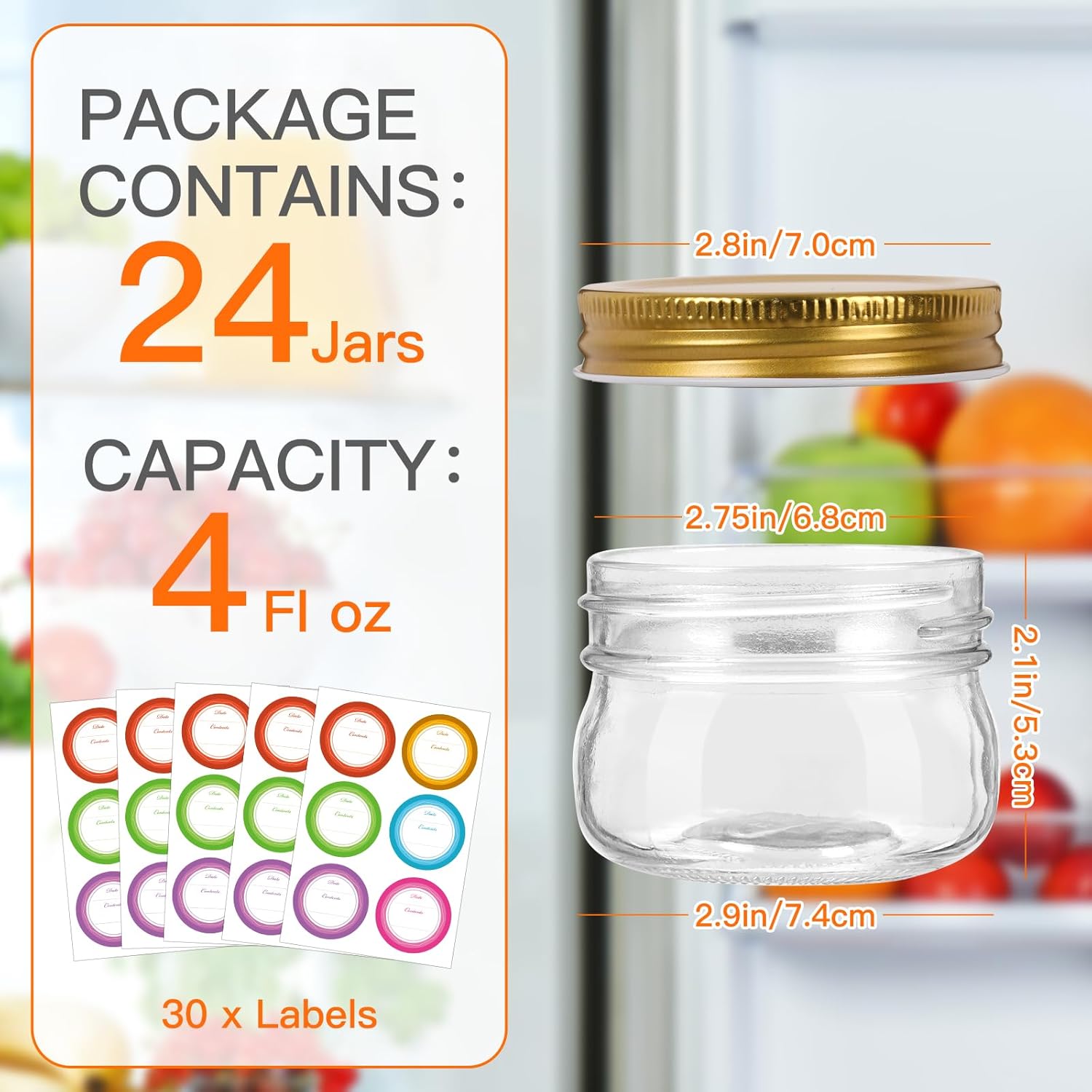 4 oz Mason Jars With Gold Lids, 24 Pack Regular Mouth Canning Jars for Jam, Honey, Yogurt, Spices, Snacks, DIY Projects, Wedding Favors- Includes 30 Stickers