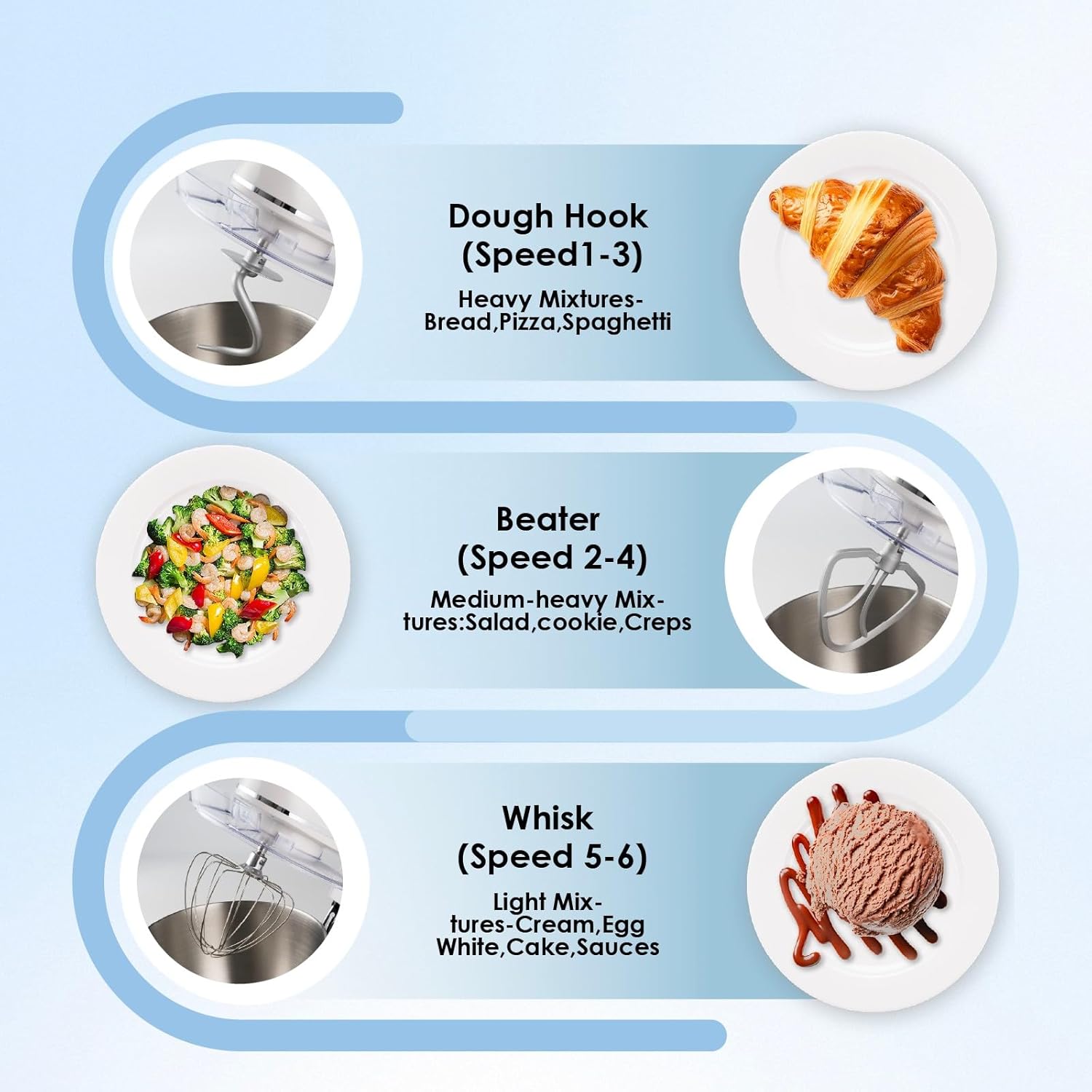 - Upgraded Accessories & Dishwasher Safe: This food mixer comes with a dough hook and flat beater made of aluminum with a protective layer, as well as a stainless steel whisk, all designed for easy use and high durability. The upgraded attachments are dishwasher-safe, allowing for quick and easy cleaning after use