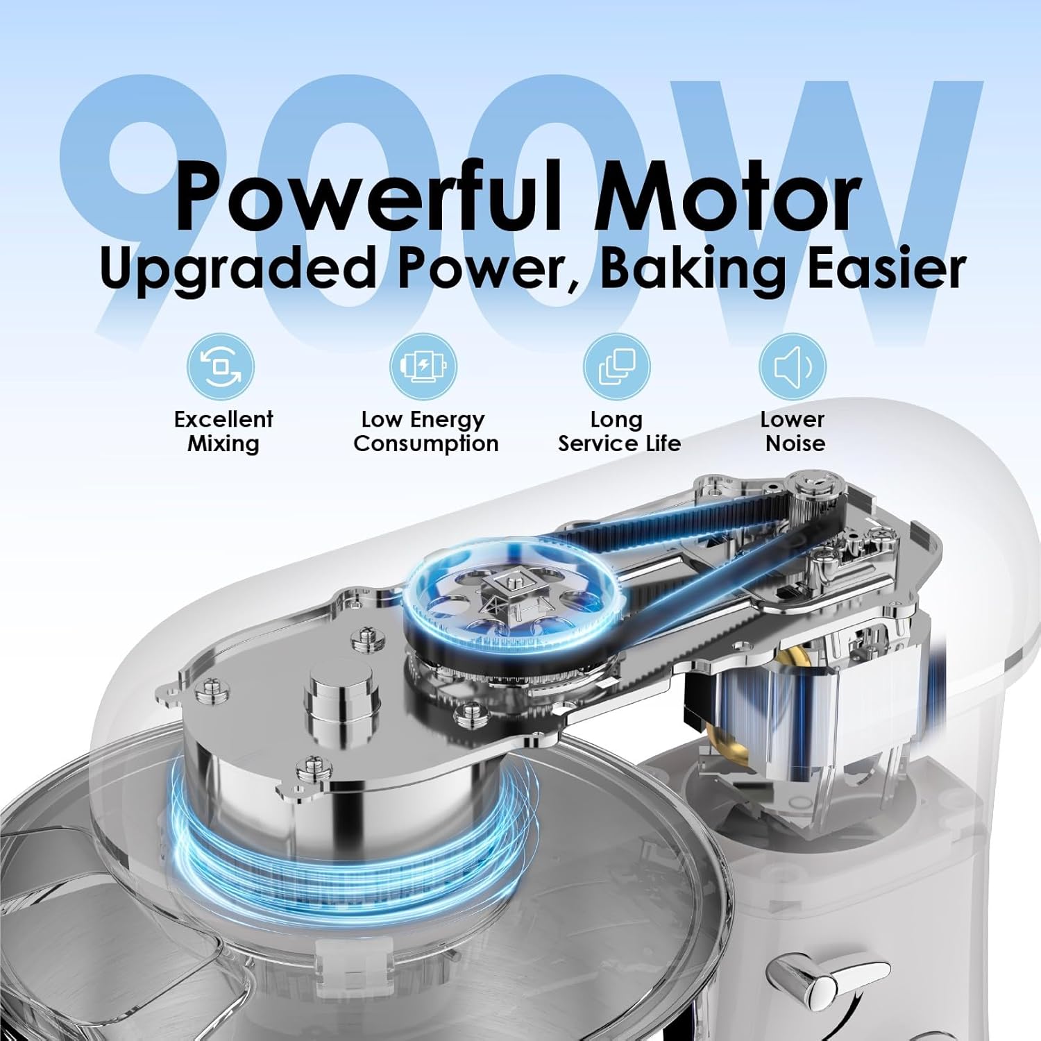 - 900W Powerful Motor: Equipped with a 900W pure copper motor, this mixer delivers robust power with smooth and efficient performance.The high-powered motor effortlessly handles heavy dough and thick mixtures while also providing precision whipping for delicate textures and consistent blending. Whether for daily use or complex baking needs, it delivers ideal results.