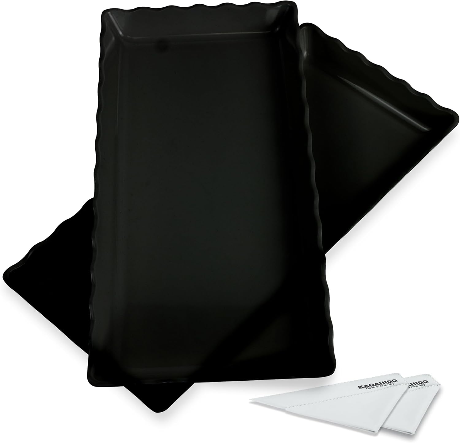 KAQAHIDO 17" x 8" x 1.5" Black Serving Tray Set, Wave Edge Melamine Platters for Cookie, Appetizer, Charcuterie, Snack, Dessert, Party Food Display, Stackable, Set of 2