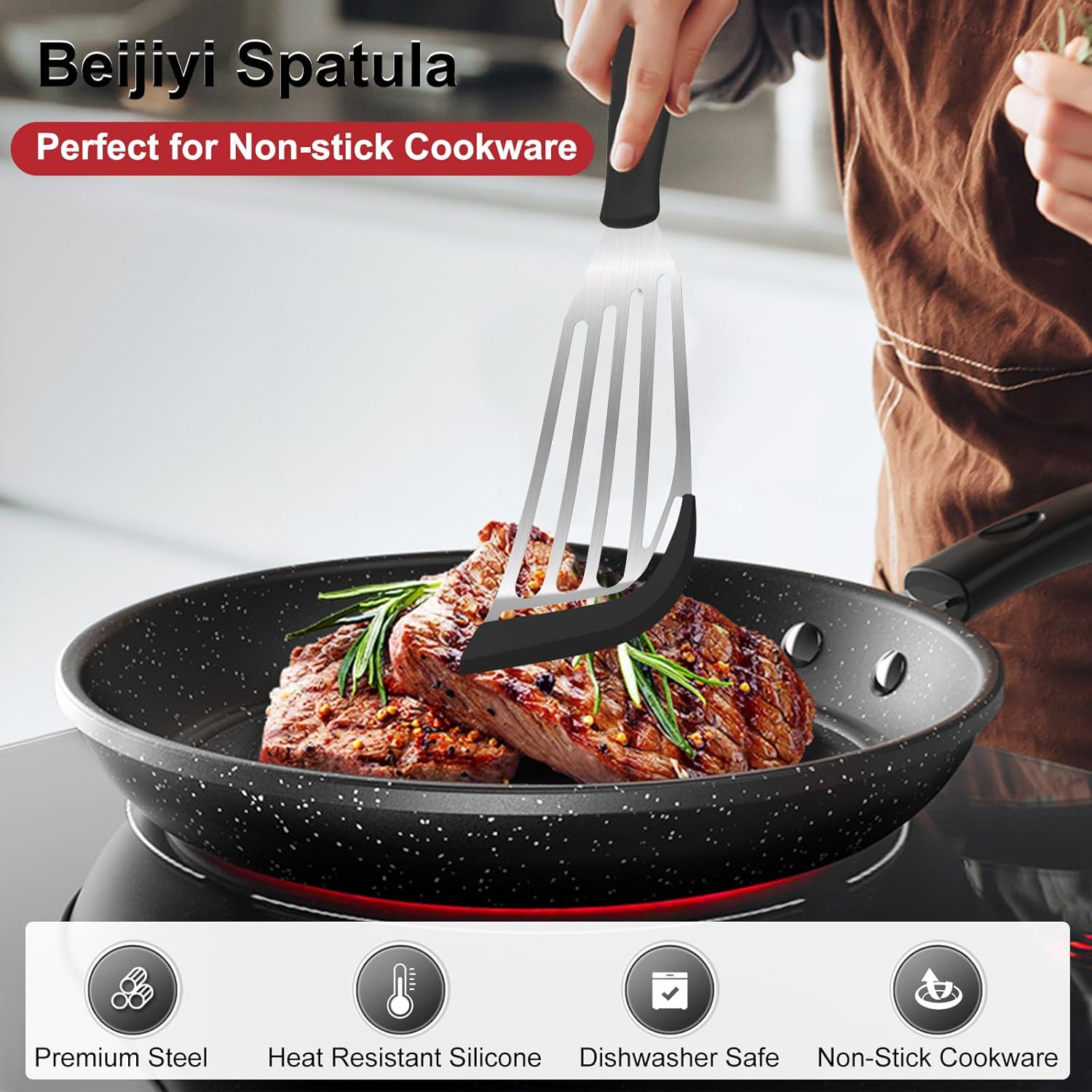 - Fish Spatula with Silicone Edge: Our fish turner kitchen spatula consists of a food-grade reinforced stainless steel core, silicone soft top edge and handle, which is high heat-resistant and rust-proof. No melt or rust