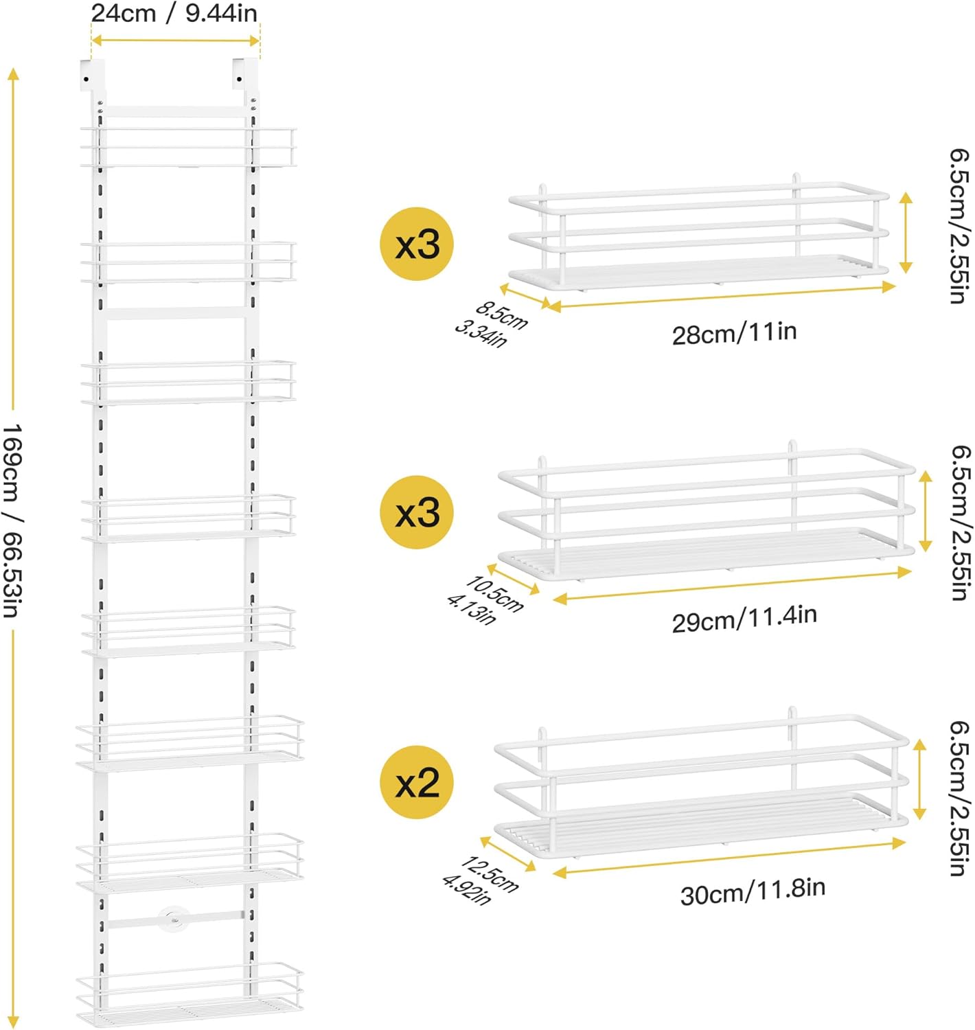 Pantry Door Organizer 12 Inch Wide, 8 Tier Hanging Adjustable Over the Door Spice Rack For Narrow Space,Matt White