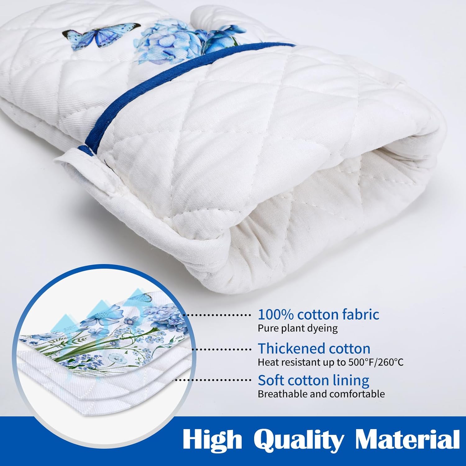 Blue Floral Oven Mitts and Pot Holders Sets 4Pcs, 100% Cotton Heat Resistant, Extra Long Oven Gloves Potholder for Kitchen Cooking Baking Decoration