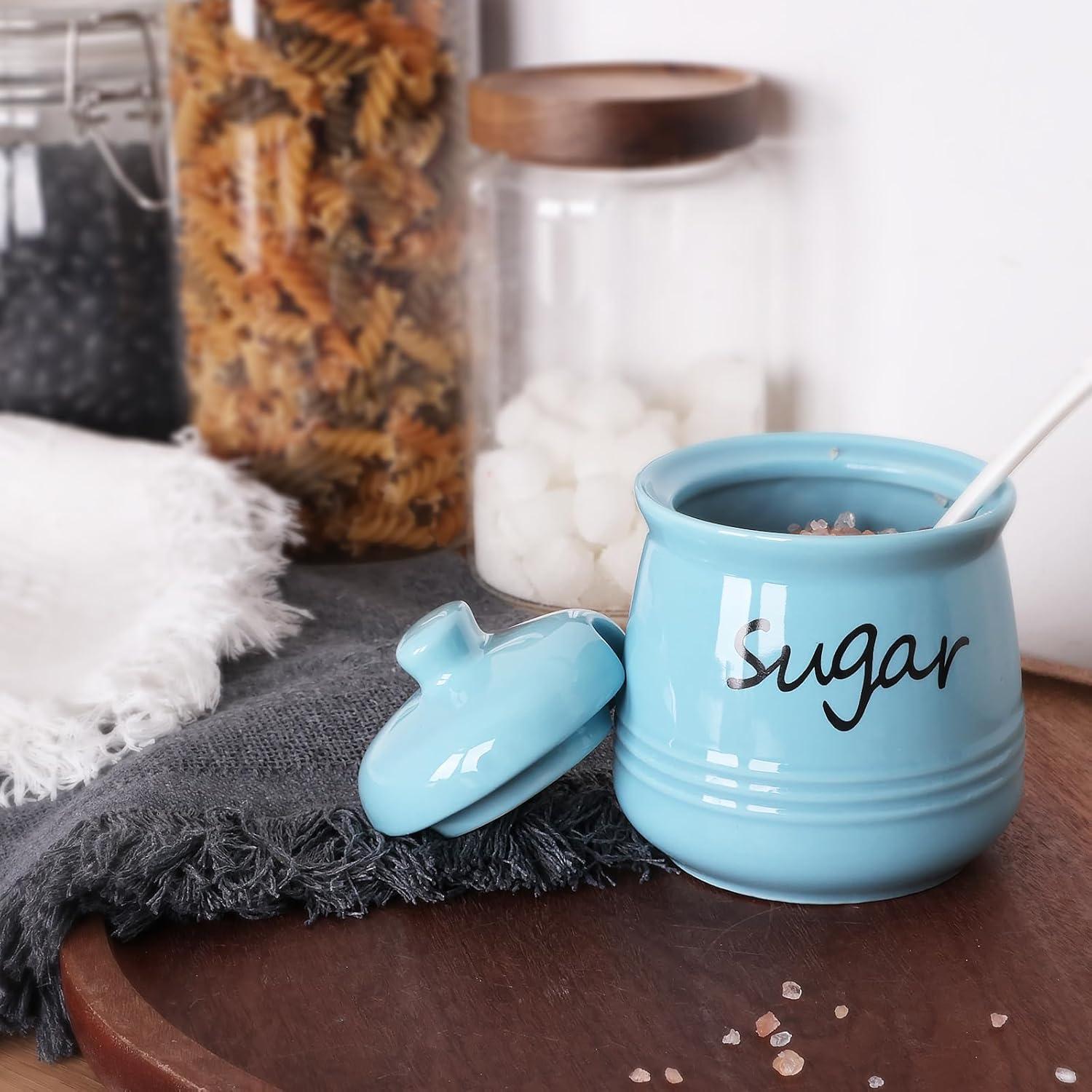 HAOTOP 12oz Sugar Bowl with Lid and Spoon,Ceramic Sugar Jar Sugar Dispenser Sugar Container Coffee Bar Accessories, Kitchen Countertop Canisters,Turquoise