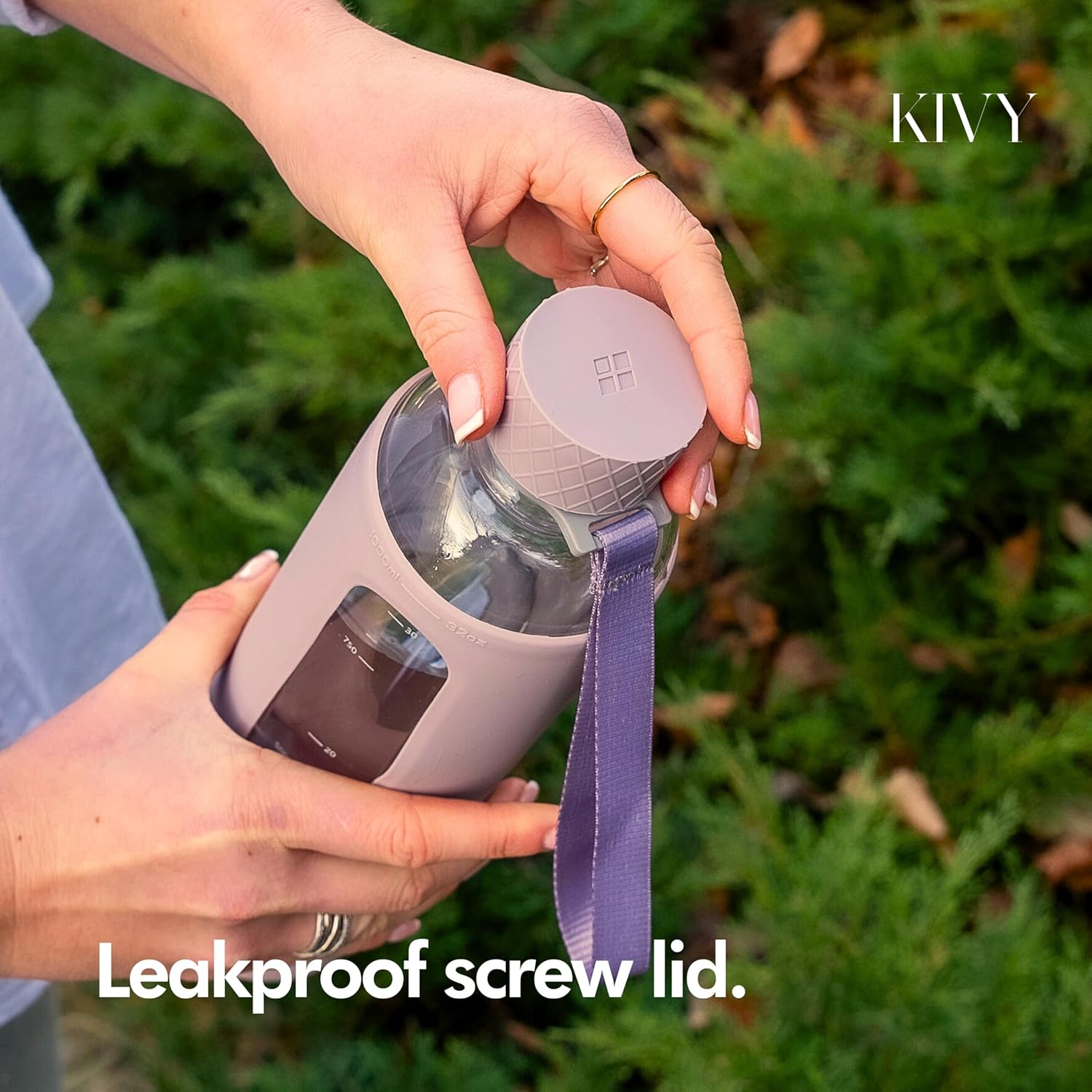 KIVY Glass Water Bottle with Silicone Sleeve 32 oz [WITH MEASUREMENT] - Borosilicate Glass Water Bottle Screw Top - Clear Bottles with Measurement Marking - Slim Waterbottle Aesthetic - Taupe