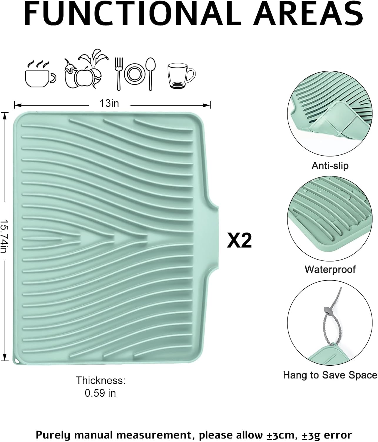 Dish Drying Mat, Stone Drying Mat for Kitchen Counter with Built-in Drain, Non-Slip Drying Matt Kitchen Counter, Heat Resistant Silicone Drying Mat, Dish Drying Pad, 2 Pcs(15.8"X 13", Mint)