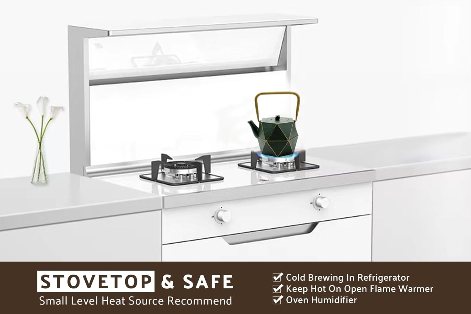 - π Tea Kettle for Stovetop - The cast iron tea kettle is sturdy and protects the teapot from shattering, which is more sturdy than the general glass/ceramic teapot. The fully enameled interior helps to taste the original and delicious tea. HEAT SOURCE: Induction Cooker, Electric Stovetop, Ceramic Stove Top, Gas Stovetop Safe, As a Humidifier Wood Burning Stove, Halogen Cooker, Fireplace for Humifying Moisture in the Air. Note: Low heat/Moderate heat is suggested, PROHIBITION OF DRY BURNING.